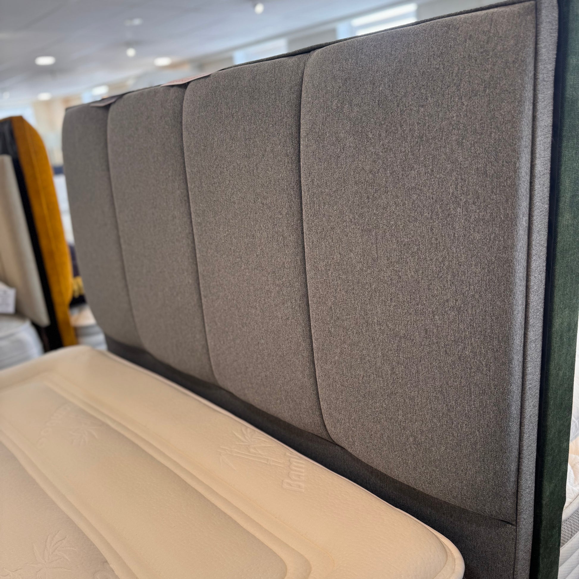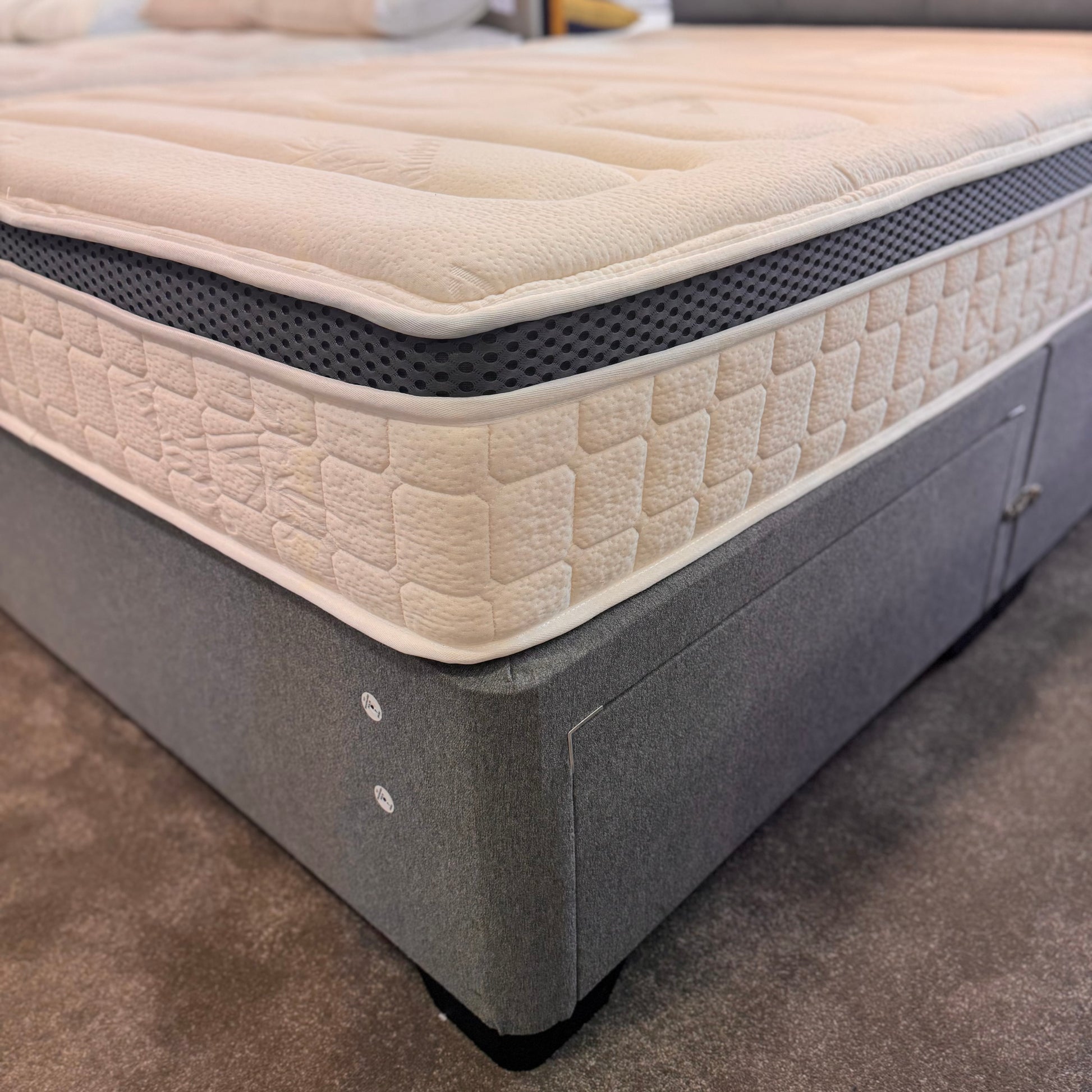 Our exceptional quality base and headboard combination delivers understated elegance for any bedroom. The two integrated drawers provide practical storage solutions, while the floor-standing headboard design offers both style and functionality. A sophisticated choice for those seeking timeless bedroom furniture. Displayed in Wool Sapphire Colour.