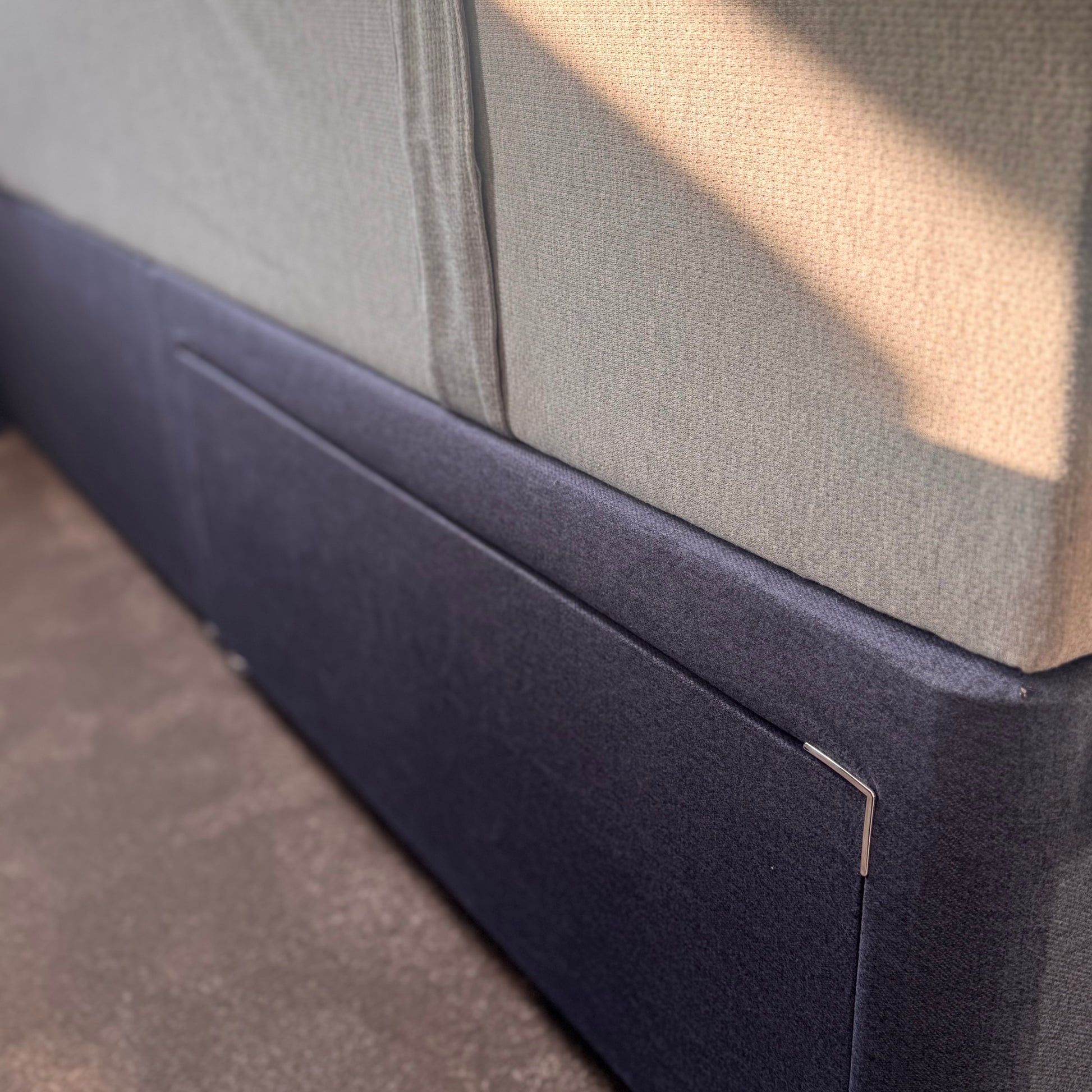 Expertly crafted British-made storage base featuring two spacious drawers, paired with our distinctive Quad Floor standing Headboard in luxurious Wool Sapphire. This elegant 4'6" ensemble combines sophisticated design with practical functionality.