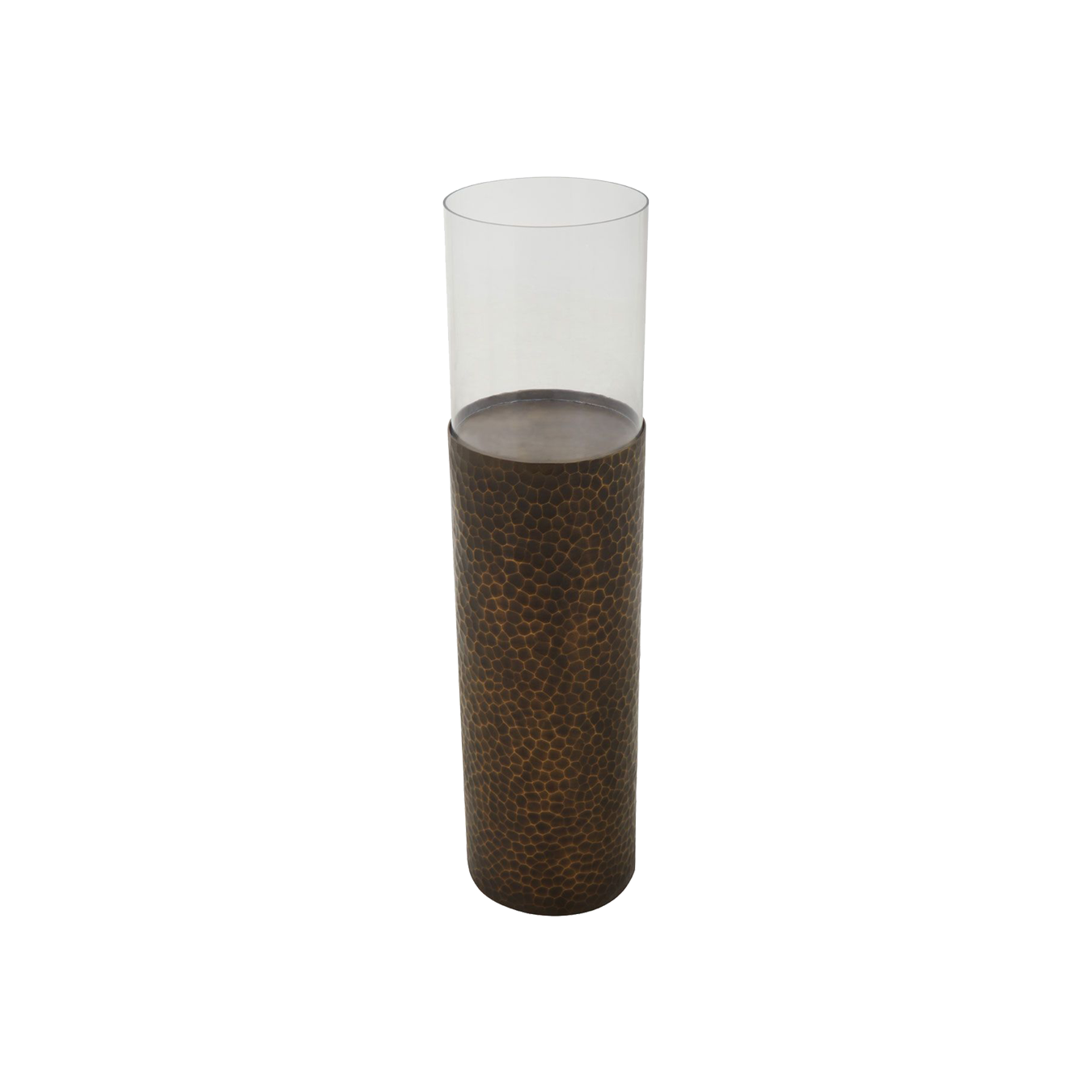 This large hurricane glass candle holder is finished in an antique gold shade with distressed texture variations and a glass candle holder up top. This large holder offers a shell skin like texture making it a unique addition to any content be it rustic or contemporary. Small Akola Gold Flair Stand Candle Holder also available.