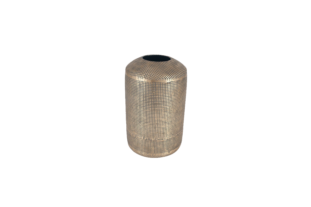Decorate your home with this textured chequered design, antique brass metal large cylinder vase. This vase can be used as a flower display for your dried flowers. The strikingly contemporary shape lends itself to be positioned in multiples or with its other counterpart vase.