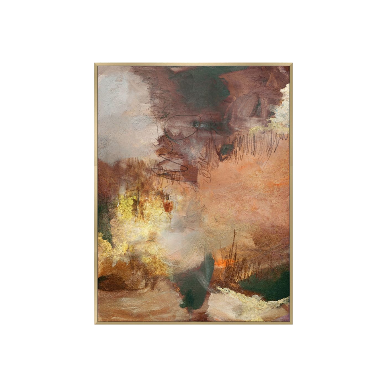 Audra is a modern original abstract painting. The antique gold floating frame acts as a rich accent that grounds the striking warm hues, while the texture and gold foil keep things current to fit within the modern-day interior. Audra, is a printed and hand-painted design, by artist Ksenia Sizaya.