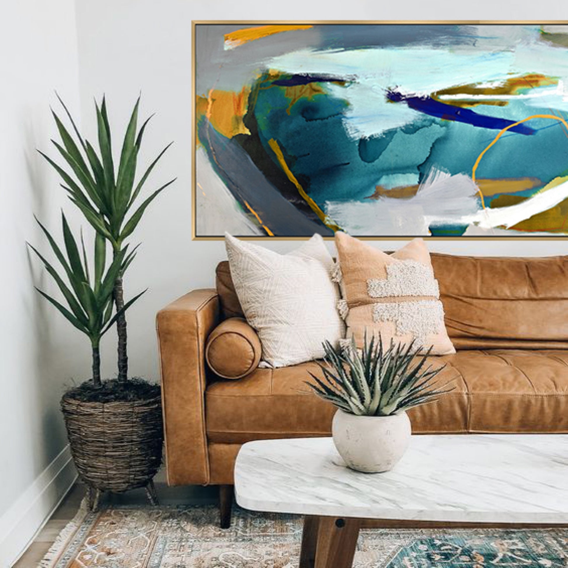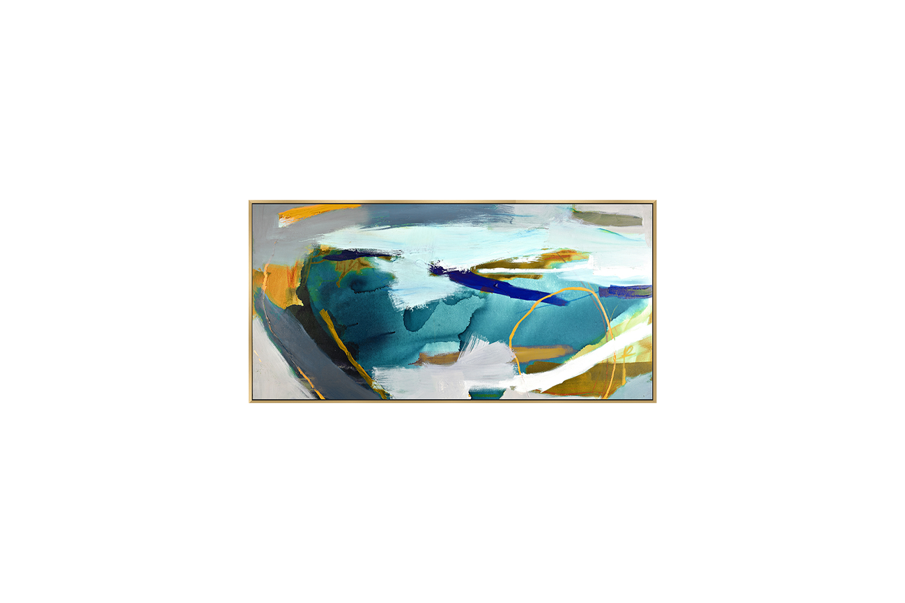Azara features deep strokes of teal and blue with splashes of ochre and gold to add dimension. will take center stage in your home. Hung vertically or horizontally. the cotton canvas provides ample space for the combination of colourways to become a focal point within the room. Azara is a printed and hand-painted design, by artist Patrick St. Germain.