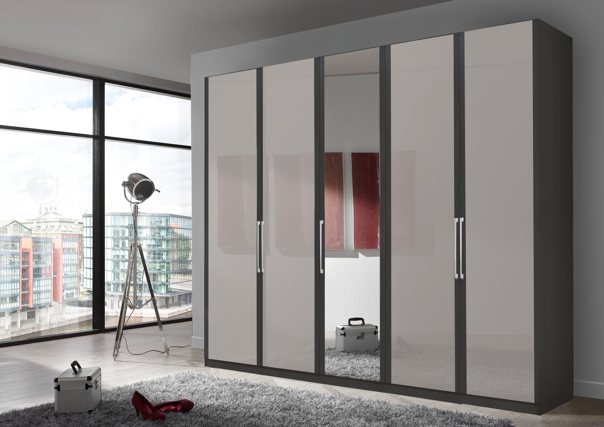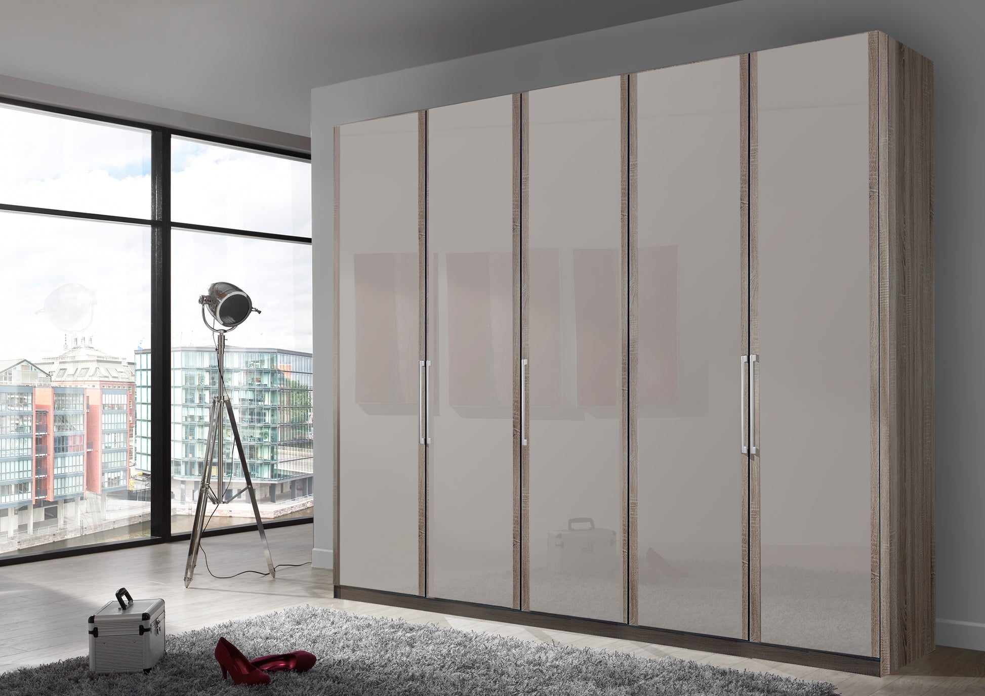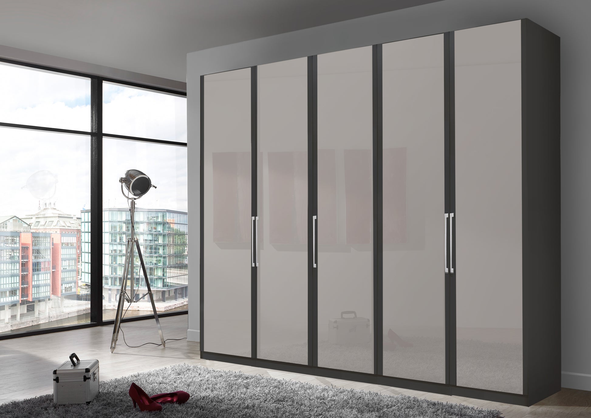 The Bermuda Hinged 5 Door Wardrobe in Glass Pebble Grey W250 H216 D58 cm