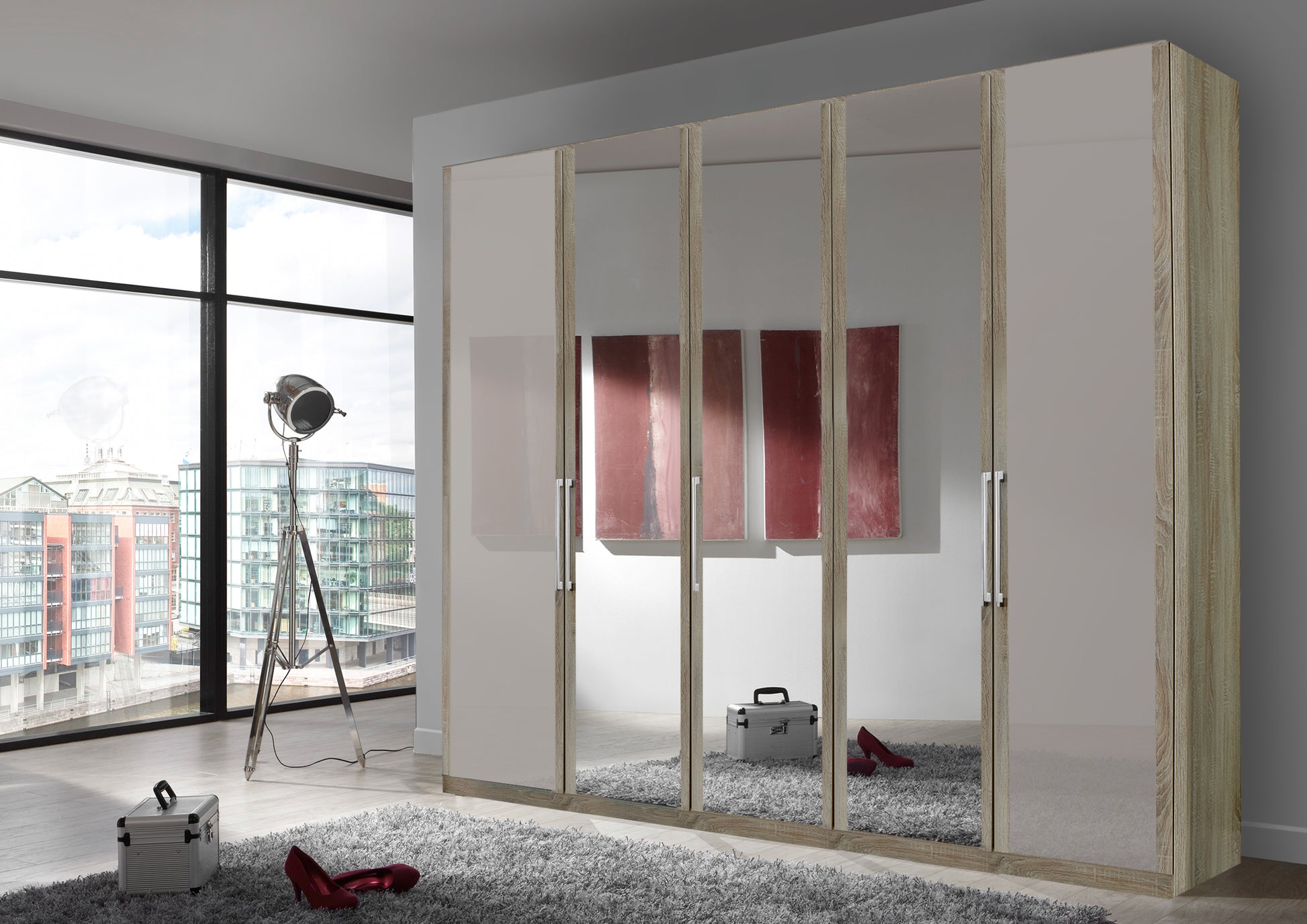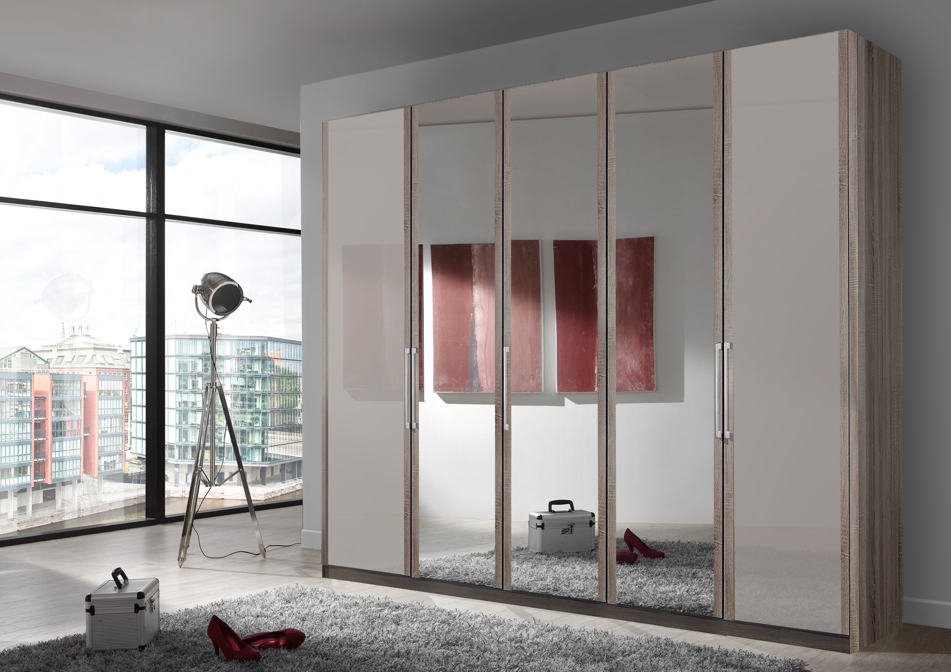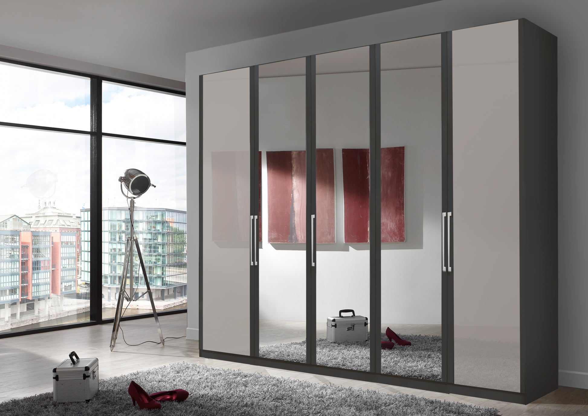 The Bermuda Hinged 5 Door Wardrobe in Glass Pebble Grey W250 H216 D58 cm