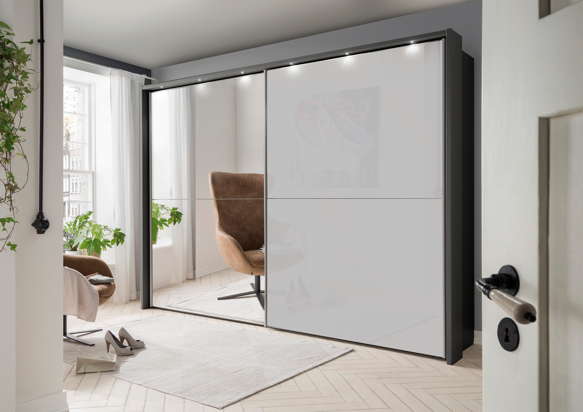 The Bermuda offers plenty of style and choice, available in five carcase finishes - white, pebble grey, graphite, rustic oak, or dark rustic oak, which can be combined with mirrors and white, pebble grey or graphite glass panels. There are four sizes of two door sliding robes from 150 to 300 cm and hinged doors ranging from a single 50cm width to a three metre six door set.