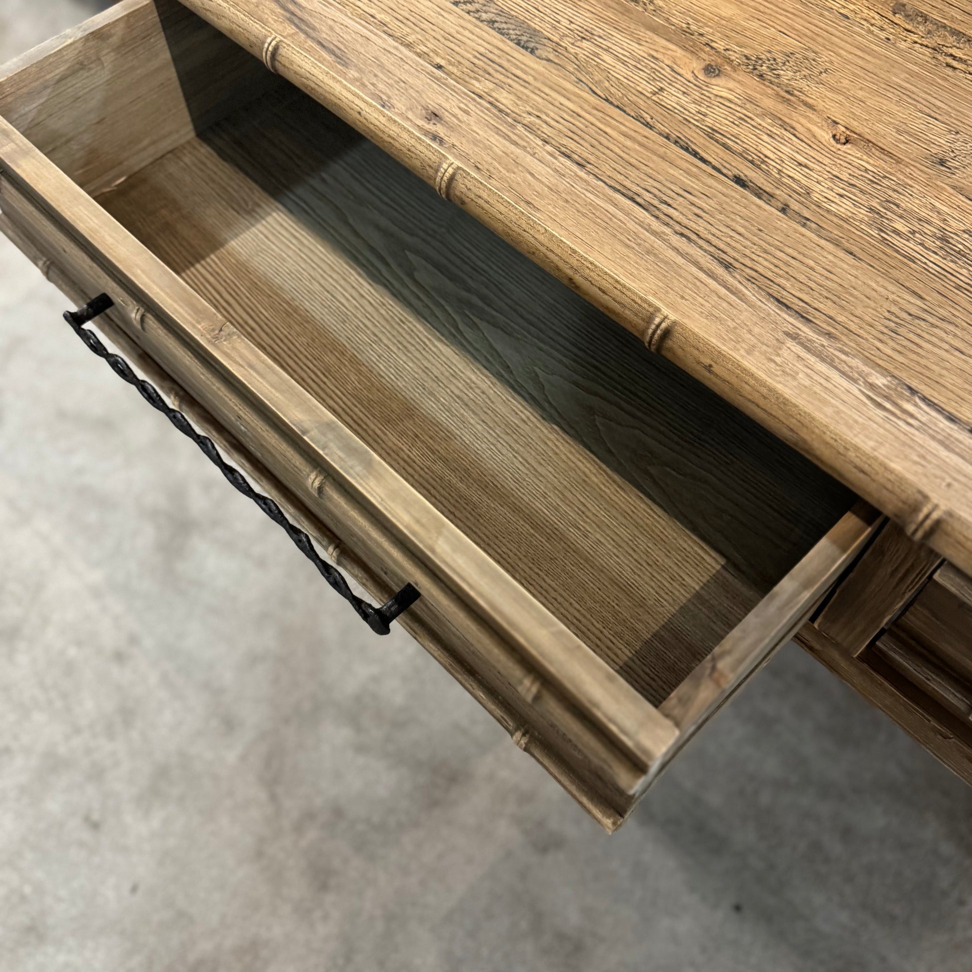 Crafted from reclaimed pine, this console marries rustic charm with refined design. The natural wood grain and raw edges provide authentic character, while delicate bamboo-inspired detailing adds visual interest. Woven metal bar handles introduce an understated elegance, creating a sophisticated storage solution that celebrates the patina and history inherent to reclaimed materials. A statement piece for those who appreciate artisanal craftsmanship and sustainable design.