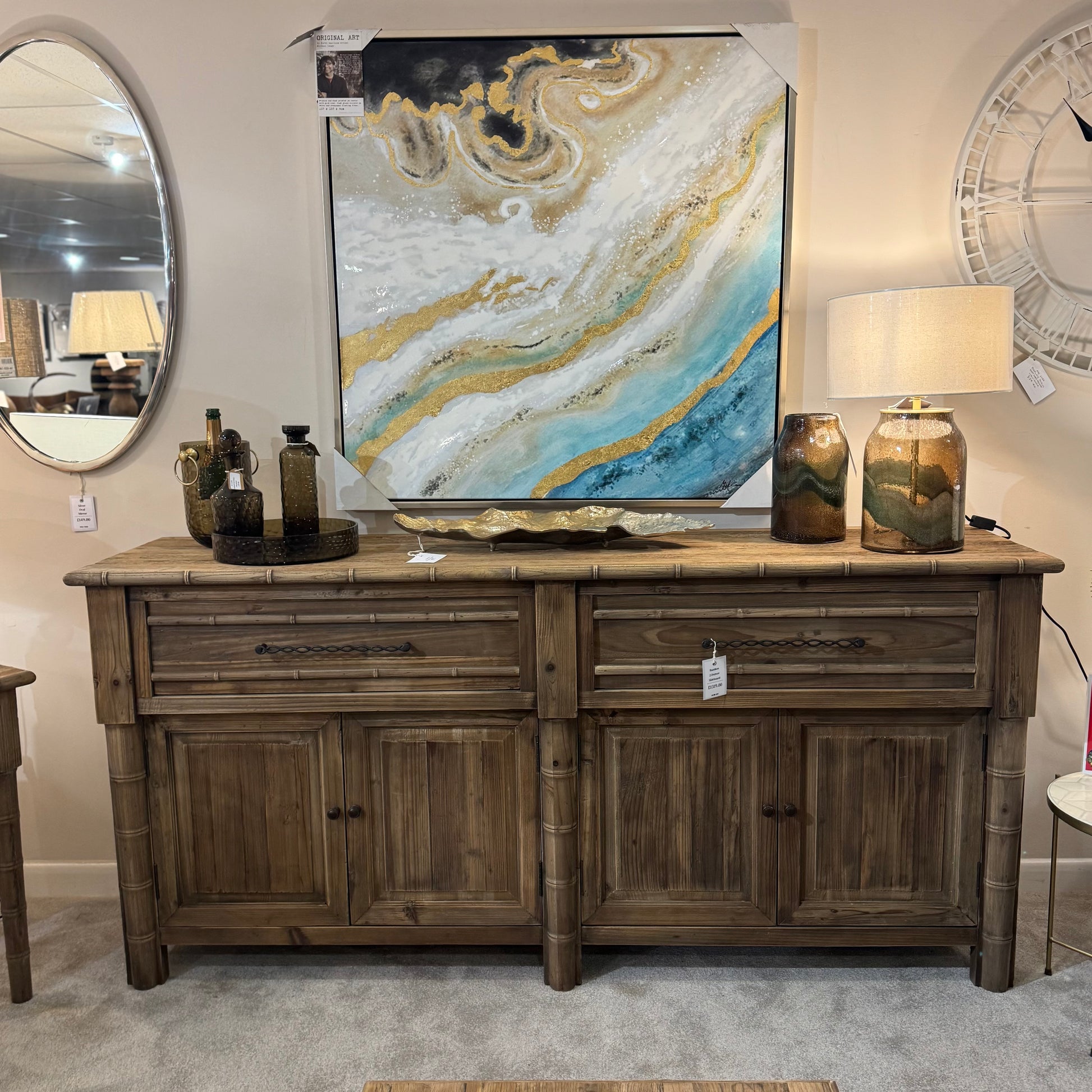 Crafted from reclaimed pine, this Sideboard marries rustic charm with refined design. The natural wood grain and raw edges provide authentic character, while delicate bamboo-inspired detailing adds visual interest. Woven metal bar handles introduce an understated elegance, creating a sophisticated storage solution that celebrates the patina and history inherent to reclaimed materials. A statement piece for those who appreciate artisanal craftsmanship and sustainable design.