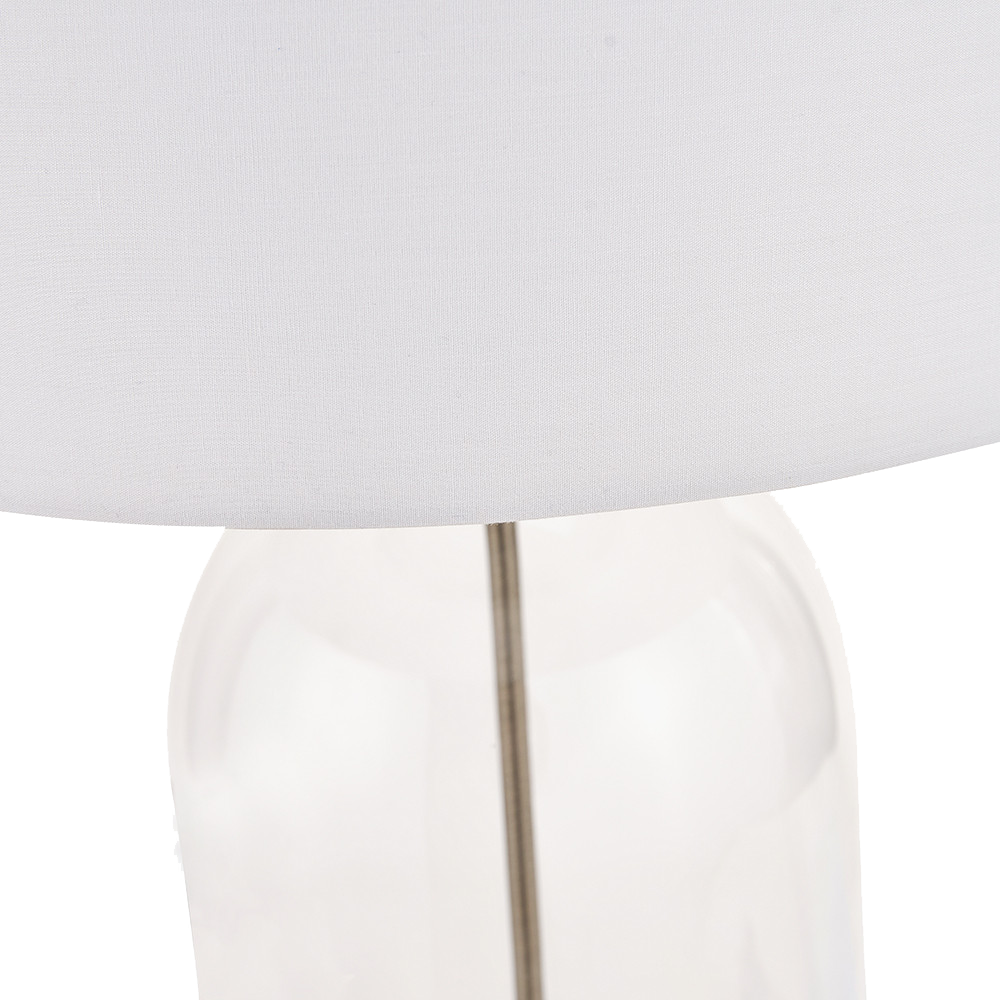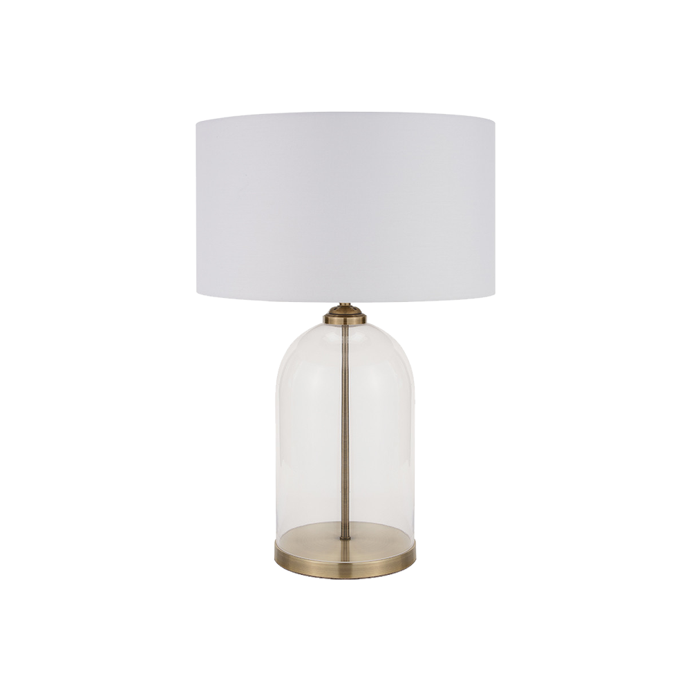 Add some classic charm to your home with this Cloche Clear Glass and Antique Brass Table Lamp. Finished in clear glass with antique brass metal detailing and topped with a fresh white faux cotton shade, it will add a subtle elegance to any side table or console.
