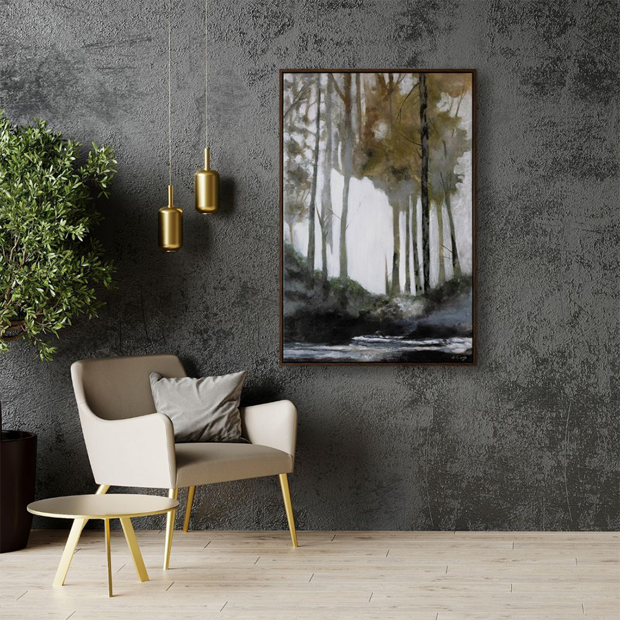 Coillte is a gaelic word which means Forest. The serene energy of crisp dawn lights breaking through the trees is captured within this canvas painting. An idyllic fit for an interior that is rich in traditional textures and tones. The rich dark frame of this piece enhances its woodland illustration and adds drama to its influence overall. Grand in size, this hand painted canvas is an impactful piece when hanging as a focal point in an entryway. Coillte, is a printed and hand-painted design, by artist Ksenia Sizaya.