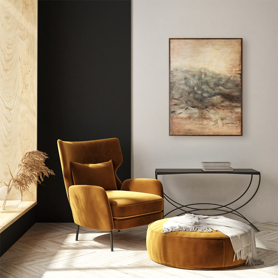 Contemporary techniques paired with depth and charm, the warm palette of Donnach brings comfort to any interior. The marriage of rich copper brown tones and soft green details create a dramatic impact while maintaining a peaceful quality. Finished within the dark wood frame, it encapsulates the piece and makes it a fit for any interior without darkening the space. Donnach is a printed and hand-painted design, by artist Ksenia Sizaya.