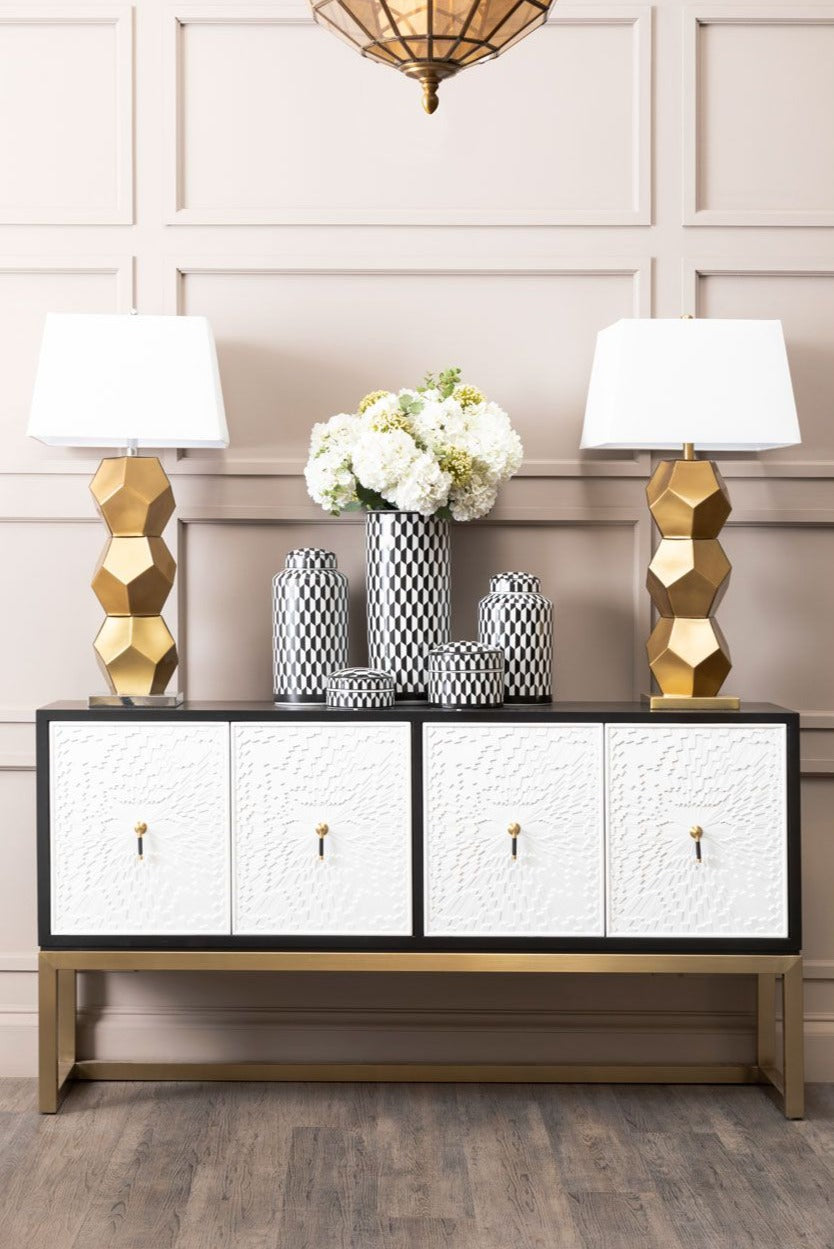 Minimal yet practical, the geometric patterns on this small jar create a three-dimensional effect. Boasting a sleek profile, this round jar is crafted expertly from durable porcelain and given a glaze finish around the surface. The hexagonal motifs in the black and white finish create a hypnotic allure that adds depth and interest to the kitchen shelf.