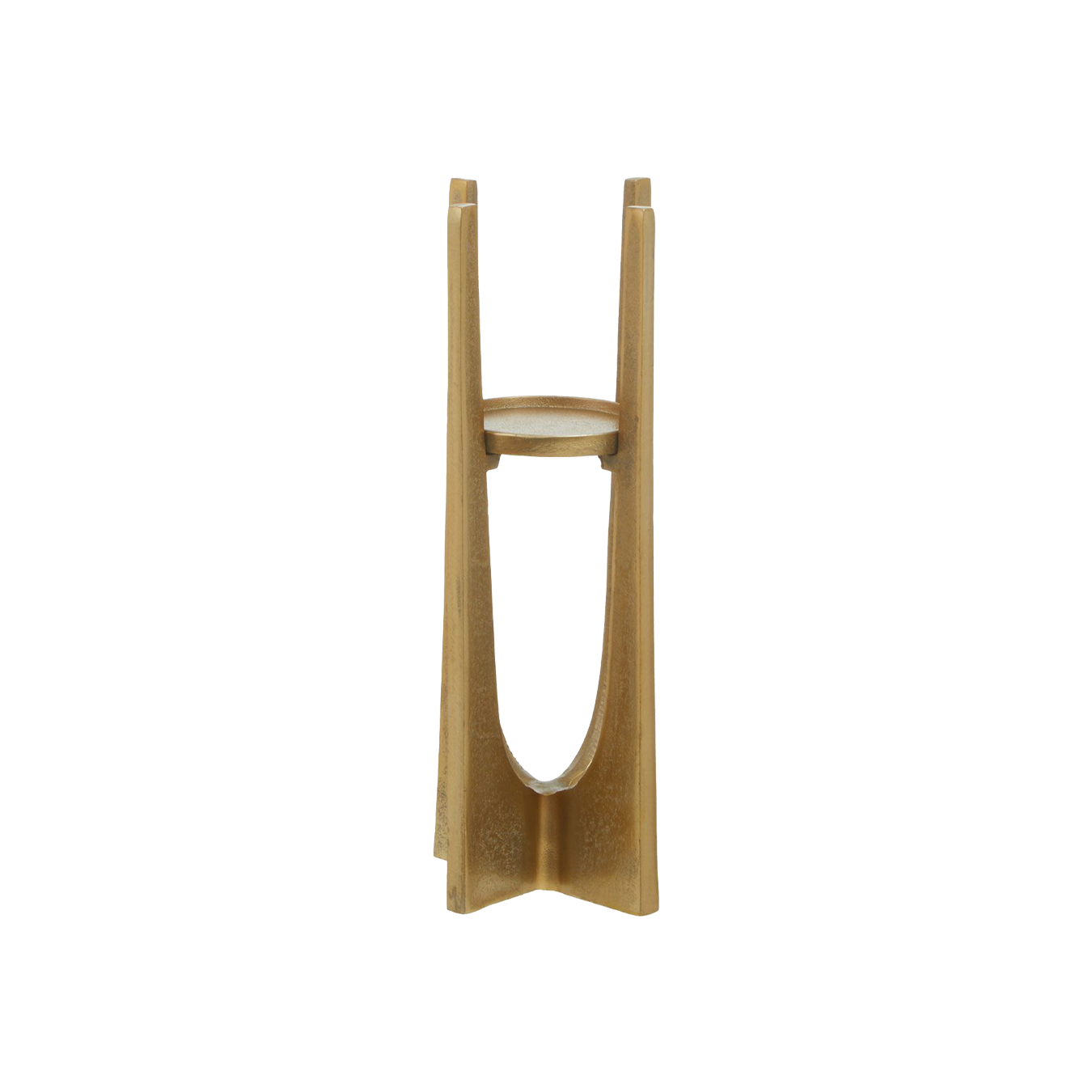 Add interest to a room with this small gold aluminium elevated candle holder. This small gold aluminium candle holder elevates the candle on four prongs, creating a contemporary design statement, especially when paired with the matching large gold candle holder.