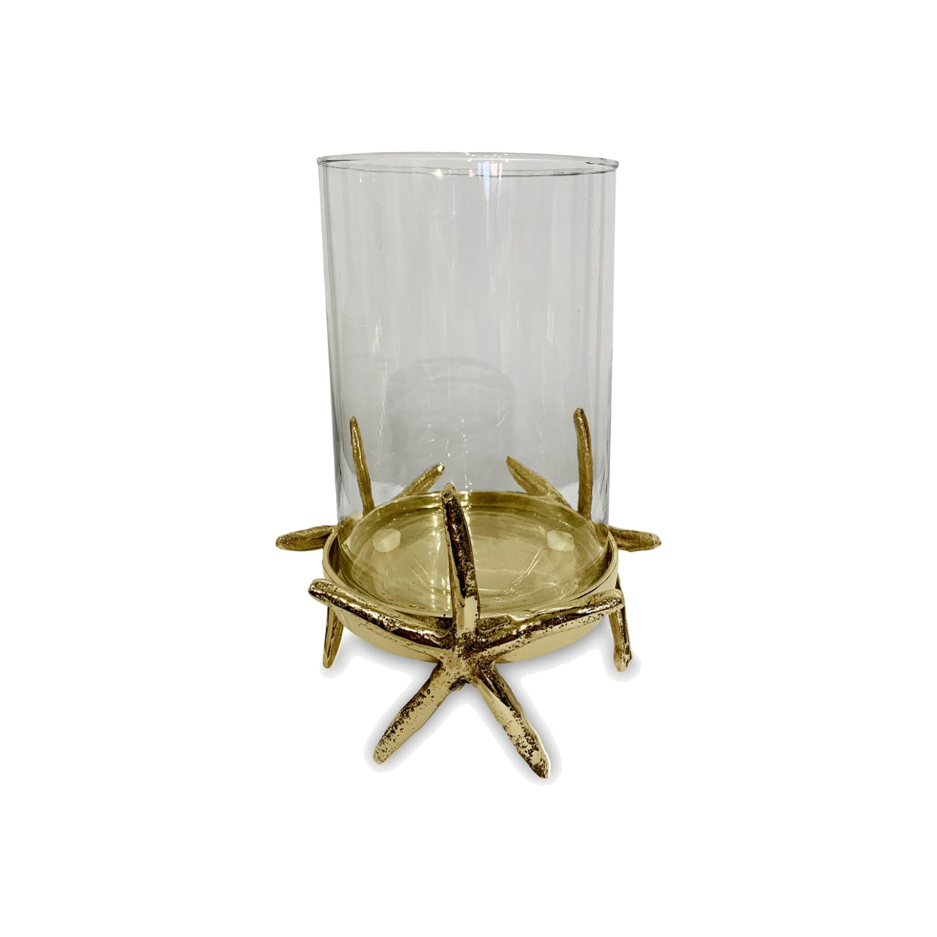 This beautiful Starfish Hurricane Lantern exudes beach house charm. A beautiful decorative accessory when both in and out of use, this hurricane lantern features a gold base with three dainty starfish attached, to hold the piece up. The lantern is topped with a simple glass candle holder