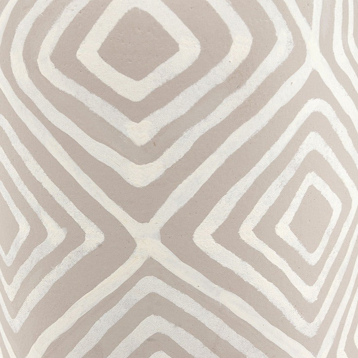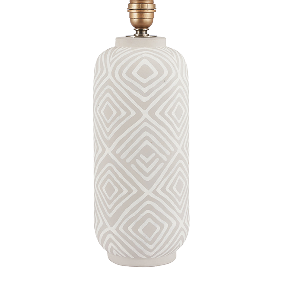 This softly curved pot has a delicate concentric squares design adorning the face. Finished in a matt grey with the hand painted design applied in matt white. Whilst Scandi in design, this table lamp will sit beautifully in any interior. Paired with 35cm Taupe Handloom Cylinder Shade or 35cm White Handloom Cylinder Shade.