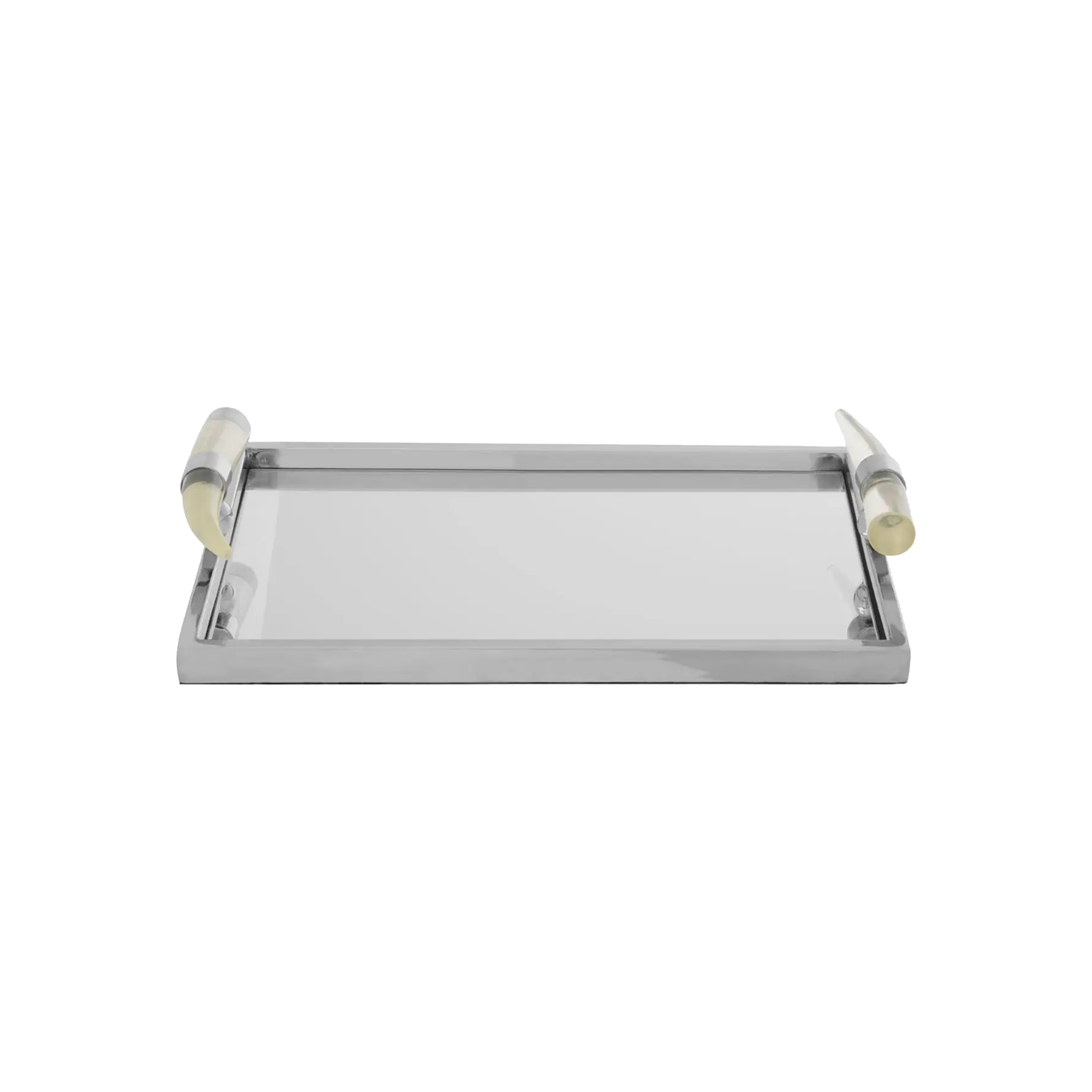 This Horn Mirrored Tray is crafted from steel with a slim border and raised sides. The mirrored surface and reflective sides create a luxurious appeal, while the decorative acrylic horn handles add an eye-catching visual element. Perfect for accentuating ornaments and décor.