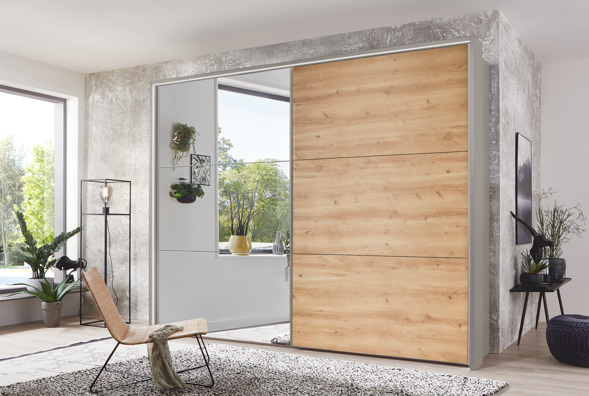 This simple and sleek, two-door sliding door robe collection offers a dash of contemporary styling to any room. This range of two-door sliding wardrobes can come in two heights and three widths to suit a wide selection of needs. Choose from carcasses in graphite, bianco oak, white and pebble grey with door fronts featuring bianco oak, white, pebble grey and crystal mirror to create a modern look.