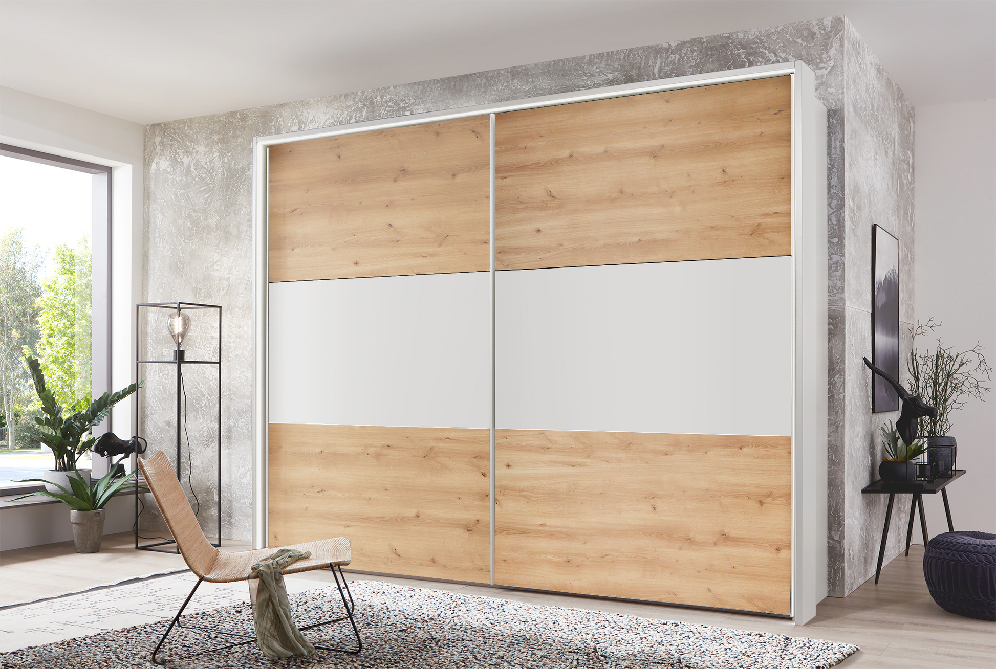 This simple and sleek, two-door sliding door robe collection offers a dash of contemporary styling to any room. This range of two-door sliding wardrobes can come in two heights and three widths to suit a wide selection of needs. Choose from carcasses in graphite, bianco oak, white and pebble grey with door fronts featuring bianco oak, white, pebble grey and crystal mirror to create a modern look.