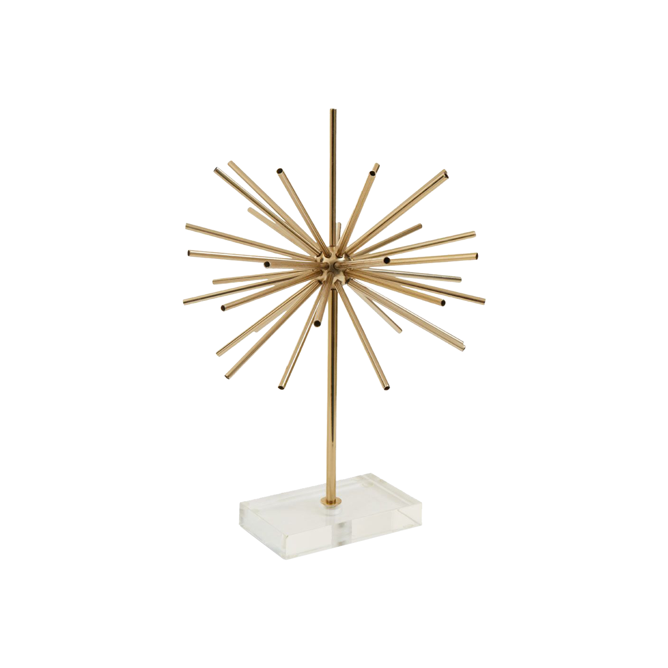 The Milton gold abstract sculpture is essential for a modern style. The gold metal spikes provide depth and interest to a room, the clear acrylic stand accentuates the sculpture allowing it to appear as if it is floating. Both aspects of this sculpture are easy to clean, ensuring that this statement piece is always something to be proud of.