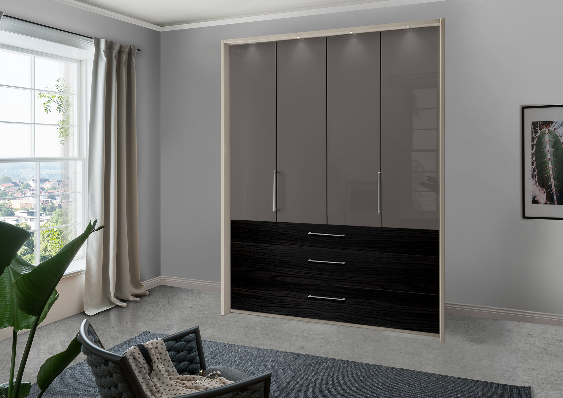 The Munich 4 Door Wardrobe in Glass Havana with Drawers W200 H216|236 D58 cm