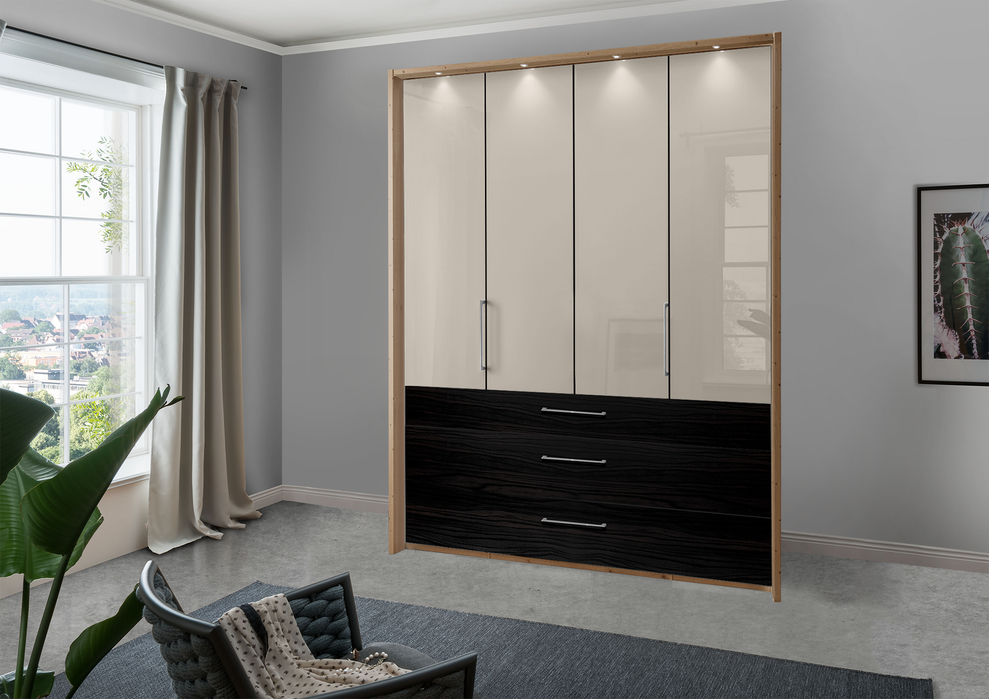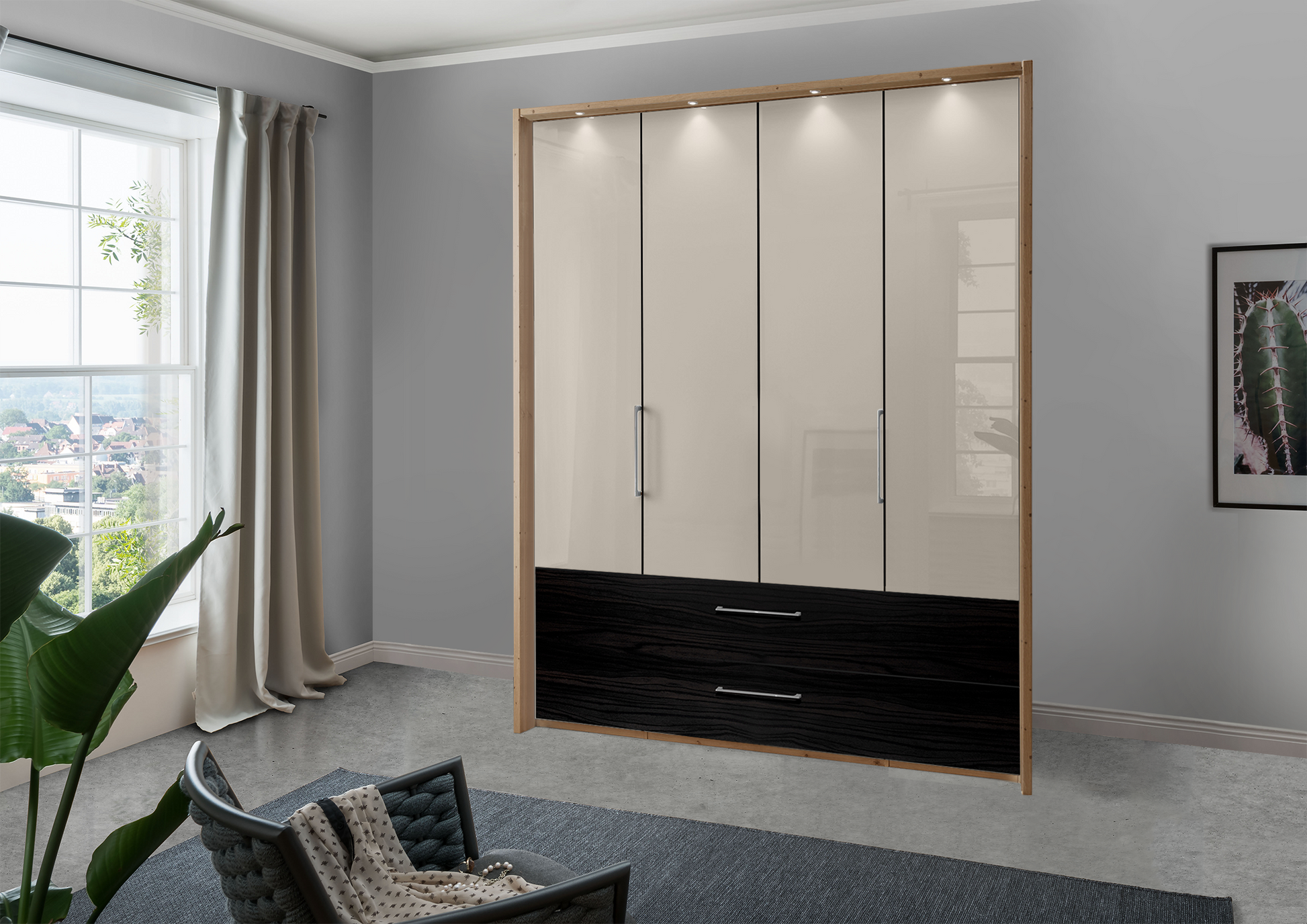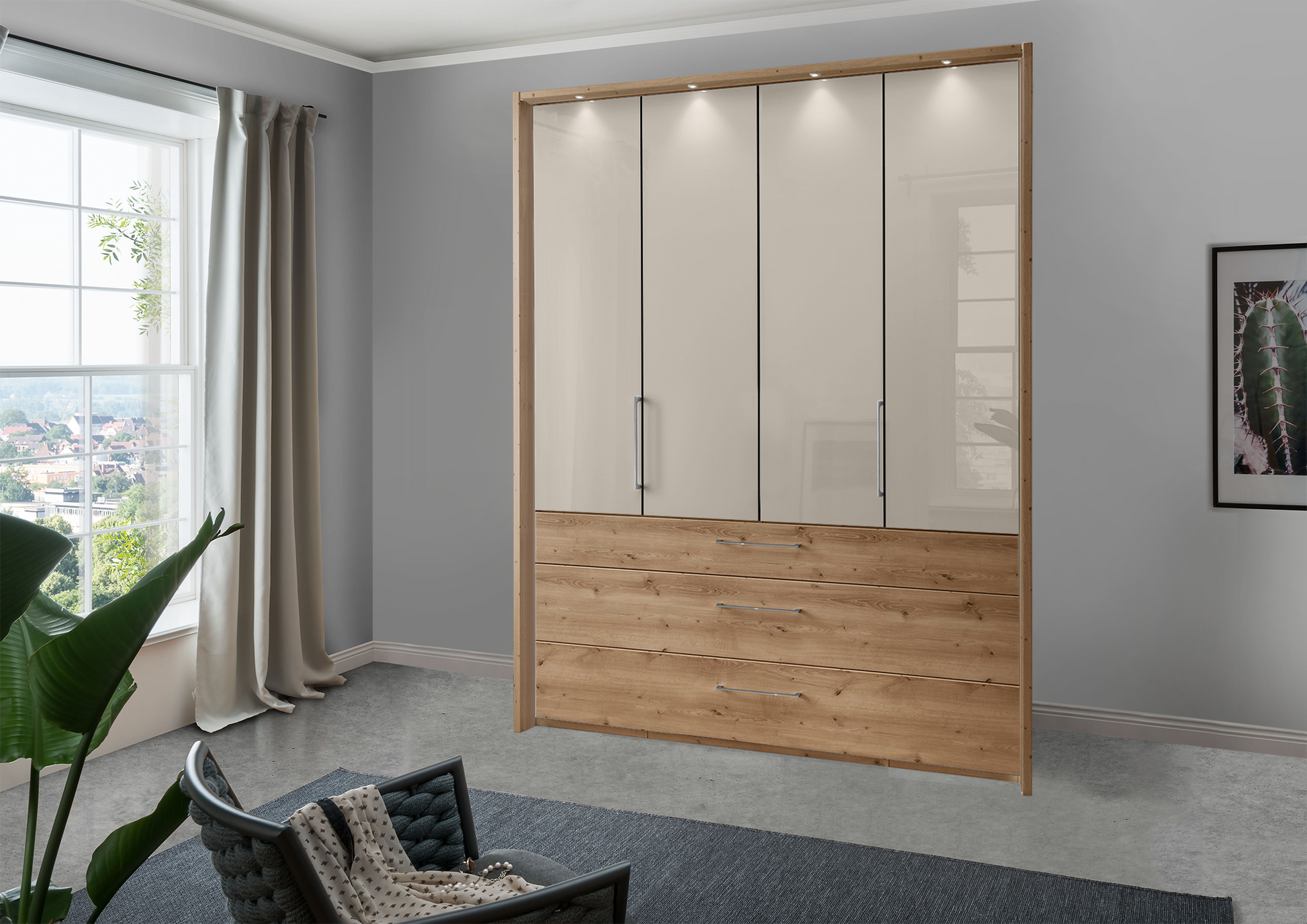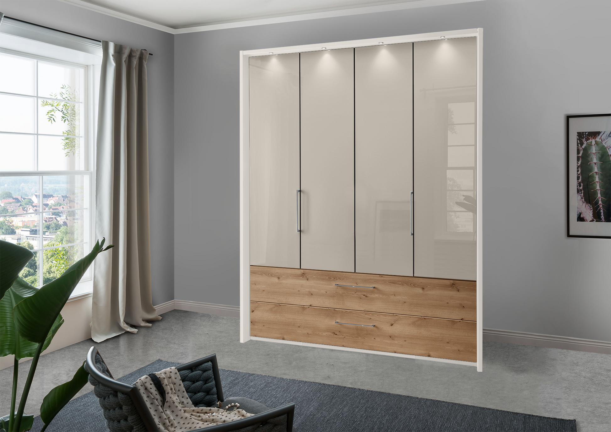 The Munich 4 Door Wardrobe in Glass Pebble Grey with Drawers W200 H216|236 D58 cm