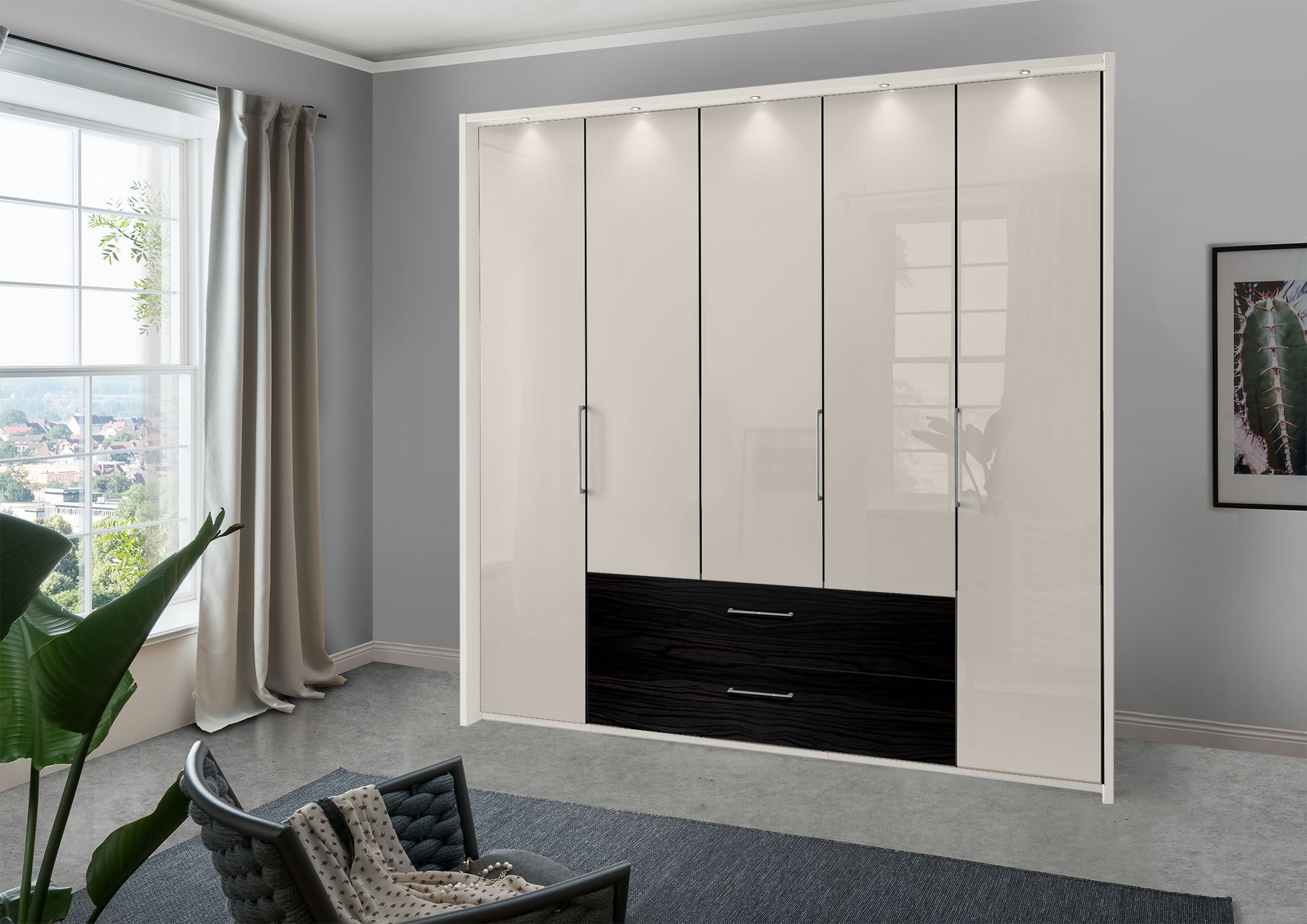 The Munich 5 Door Wardrobe in Glass Champagne with Drawers W250 H216|236 D58 cm