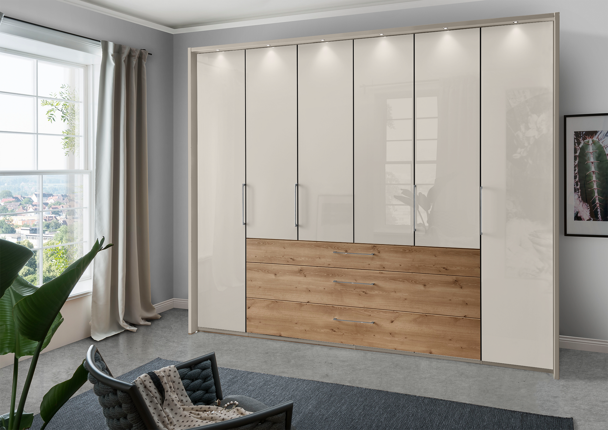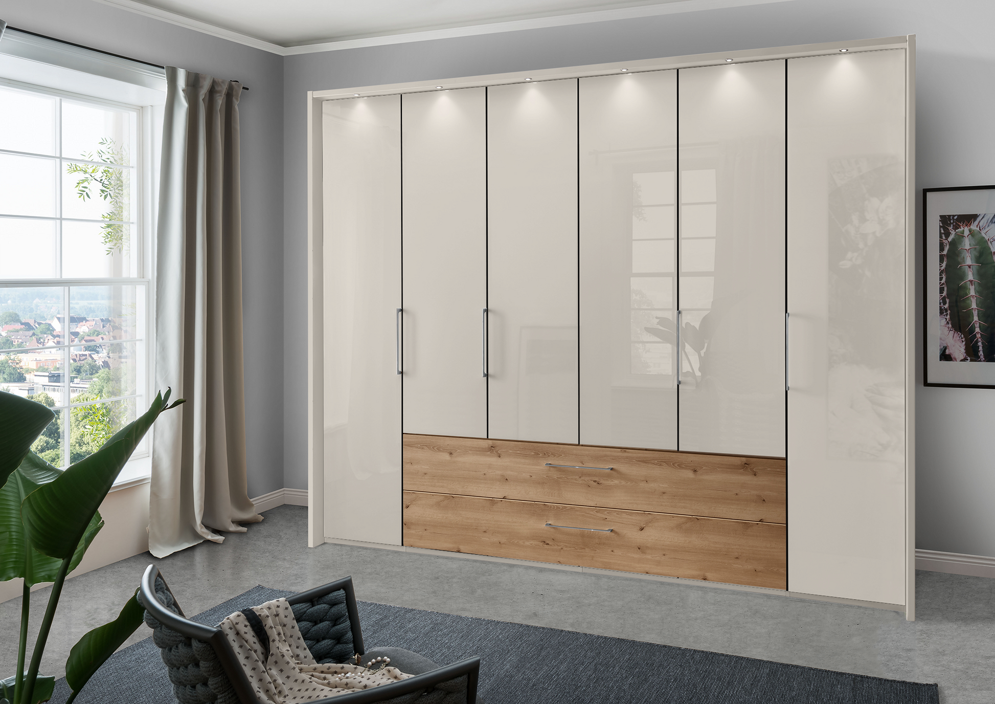 The Munich 6 Door Wardrobe in Glass Champagne with Drawers W300 H216|236 D58 cm