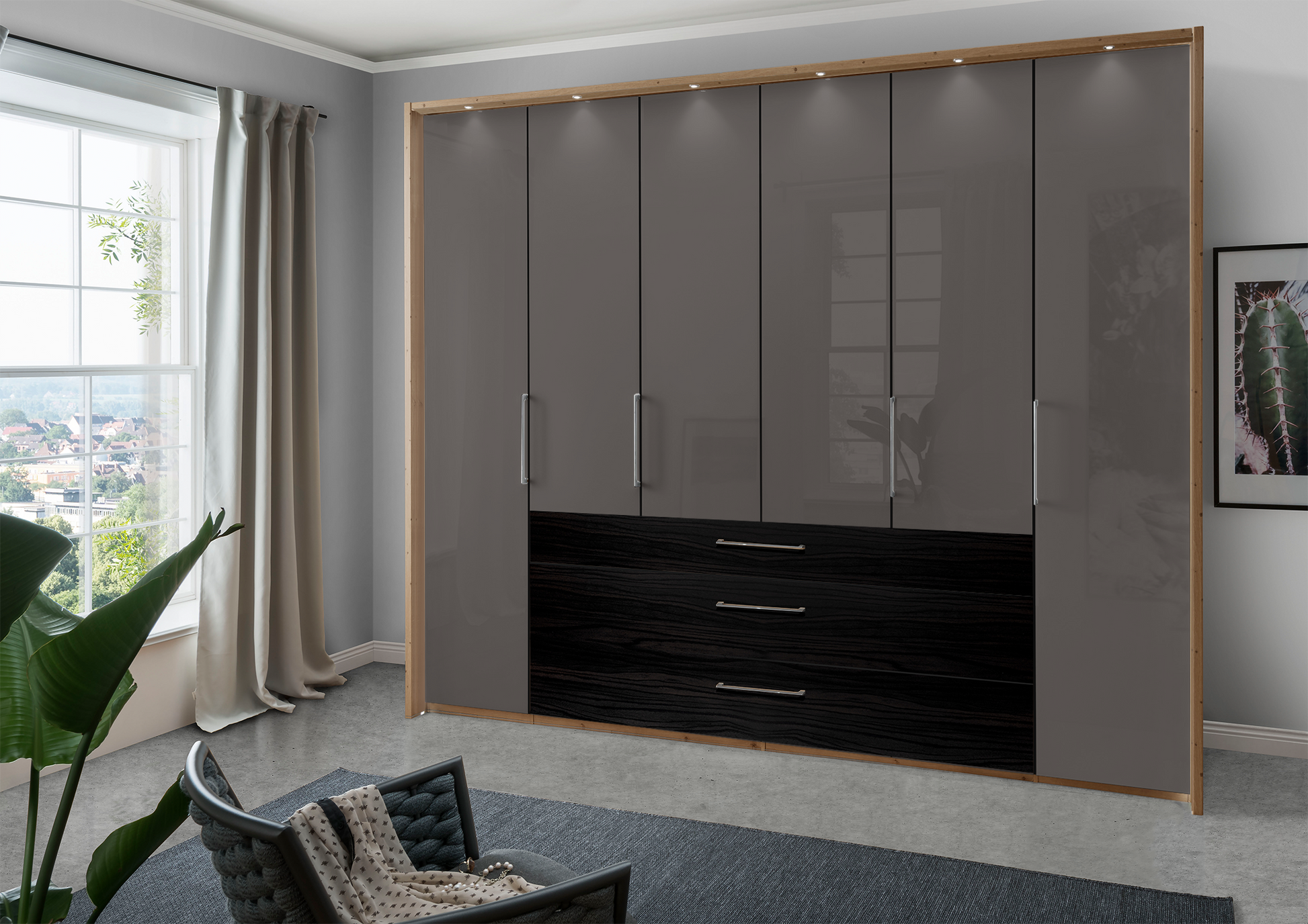 The Munich 6 Door Wardrobe in Glass Havana with Drawers W300 H216|236 D58 cm