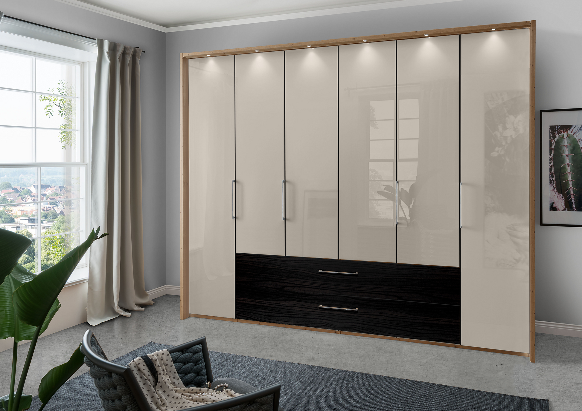 The Munich 6 Door Wardrobe in Glass Pebble Grey with Drawers W300 H216|236 D58 cm