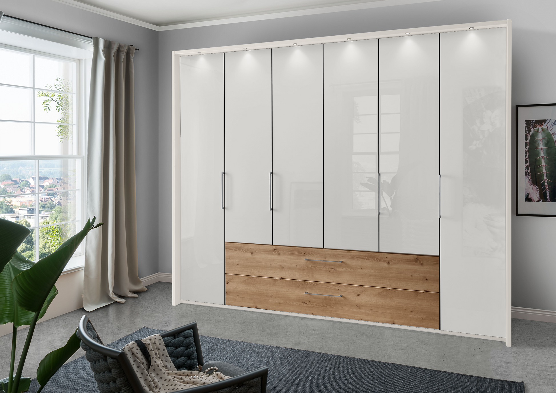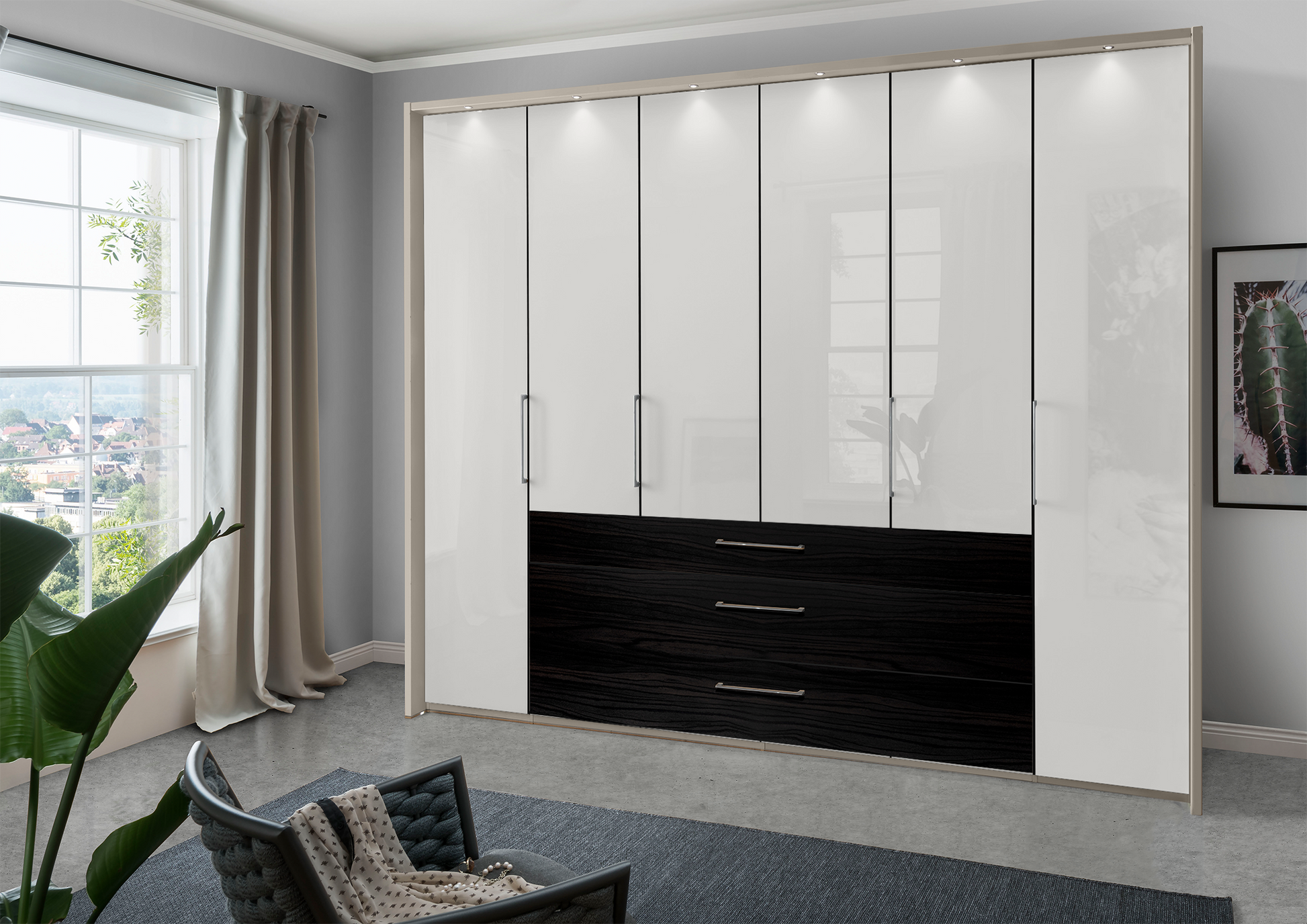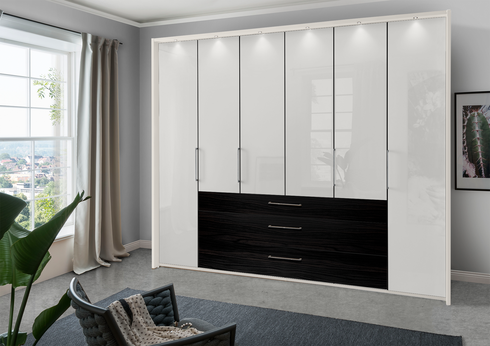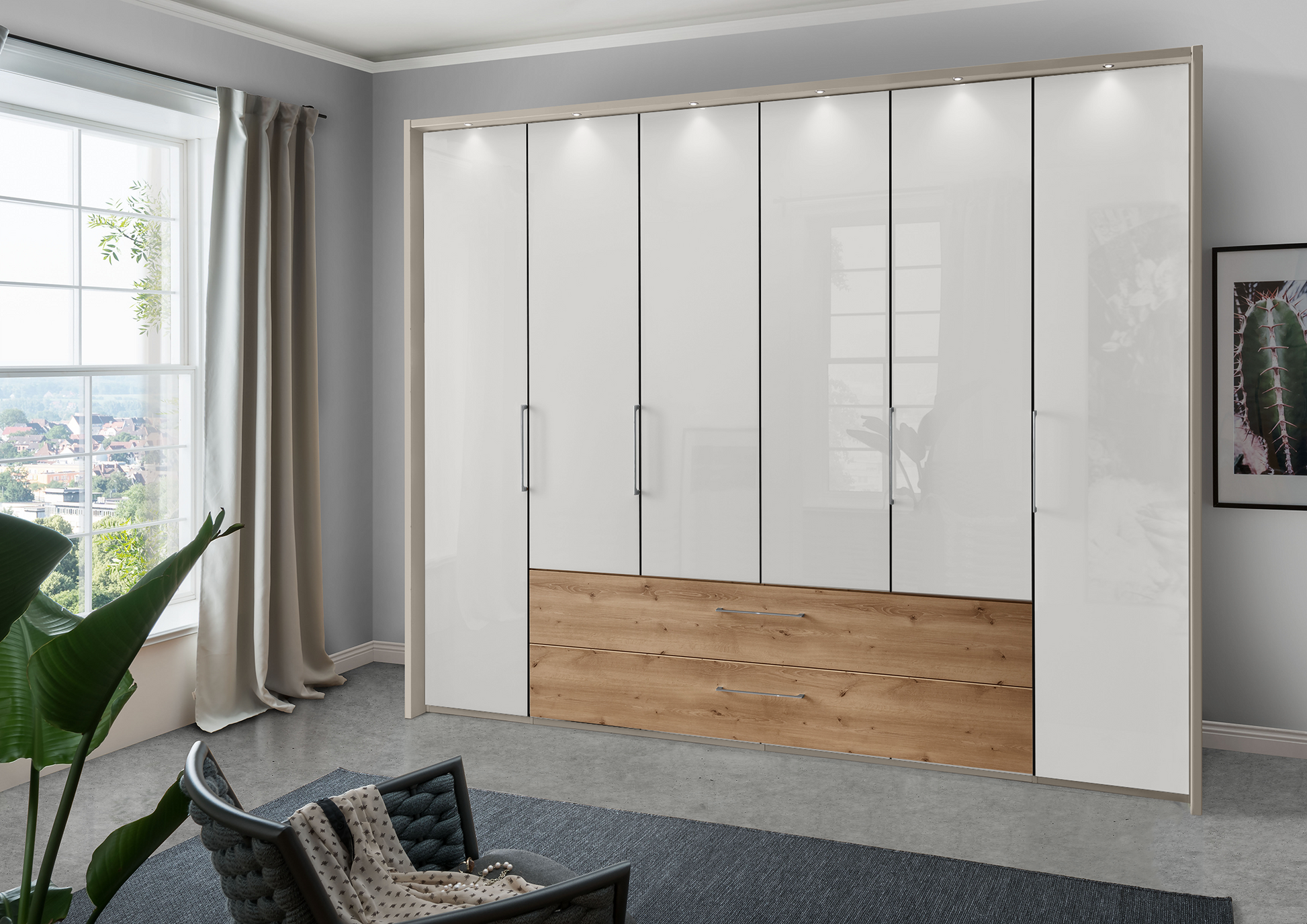 The Munich 6 Door Wardrobe in Glass White with Drawers W300 H216|236 D58 cm