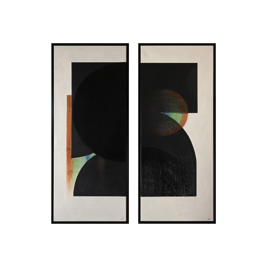 Neven art piece features the burst of playful colours peaking through block of texture in an abstract arrangement. Prime for the modern bedroom or living space, each piece brings its own charm and character while still complimenting each other. Hand-painted with ebony black paint, the composition stretches across two prints, each presented in a simple black frame. Neven, is a printed and hand-painted design, by artist Edward View.