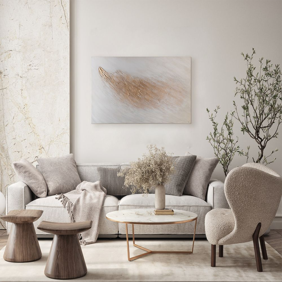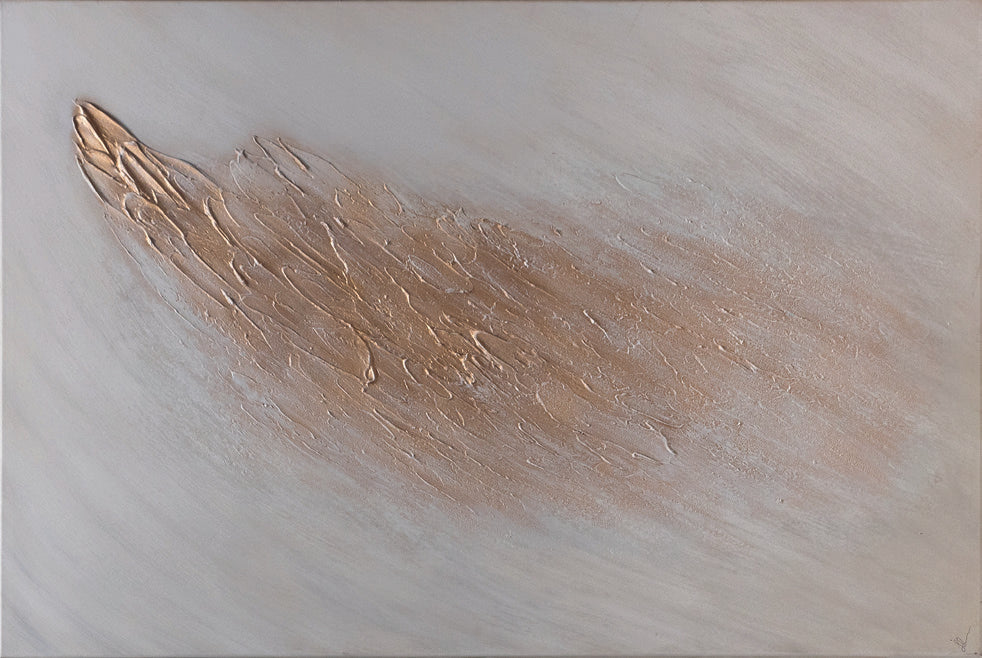 The Óige art is one for the neutral lovers. Soothing, heavy textures of metallic paint and luscious strokes of molding paste are generously applied to create depth and dimension to this piece. The frameless cotton canvas will surely add visual interest when hung in a hallway or living room. Óige is a hand-painted design, by artist Jess Kelly.