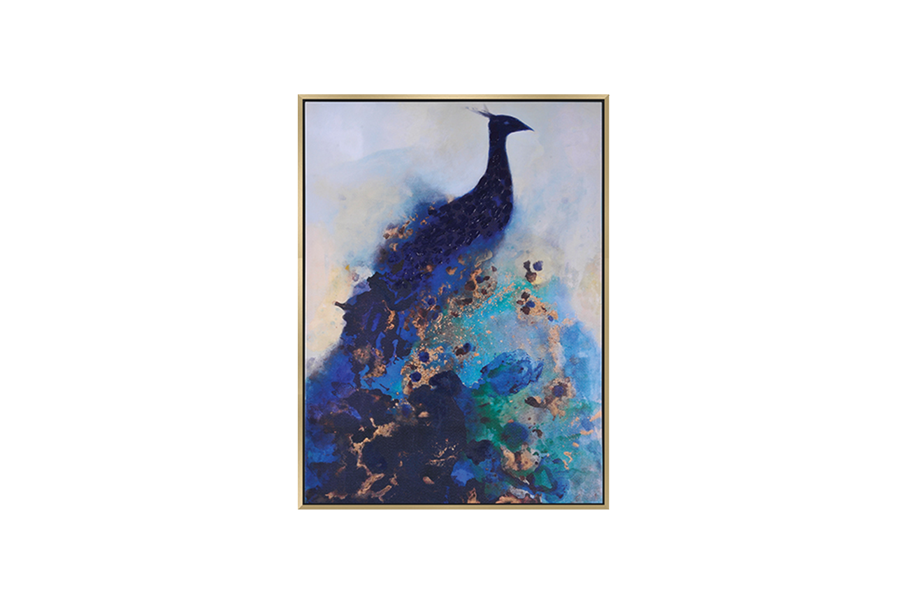 The noble peacock features bold hues of blue and navy with copper leaf accents, finished inside a champagne frame. Peacock is a printed and hand-painted design, by artist Jae Park Joon.