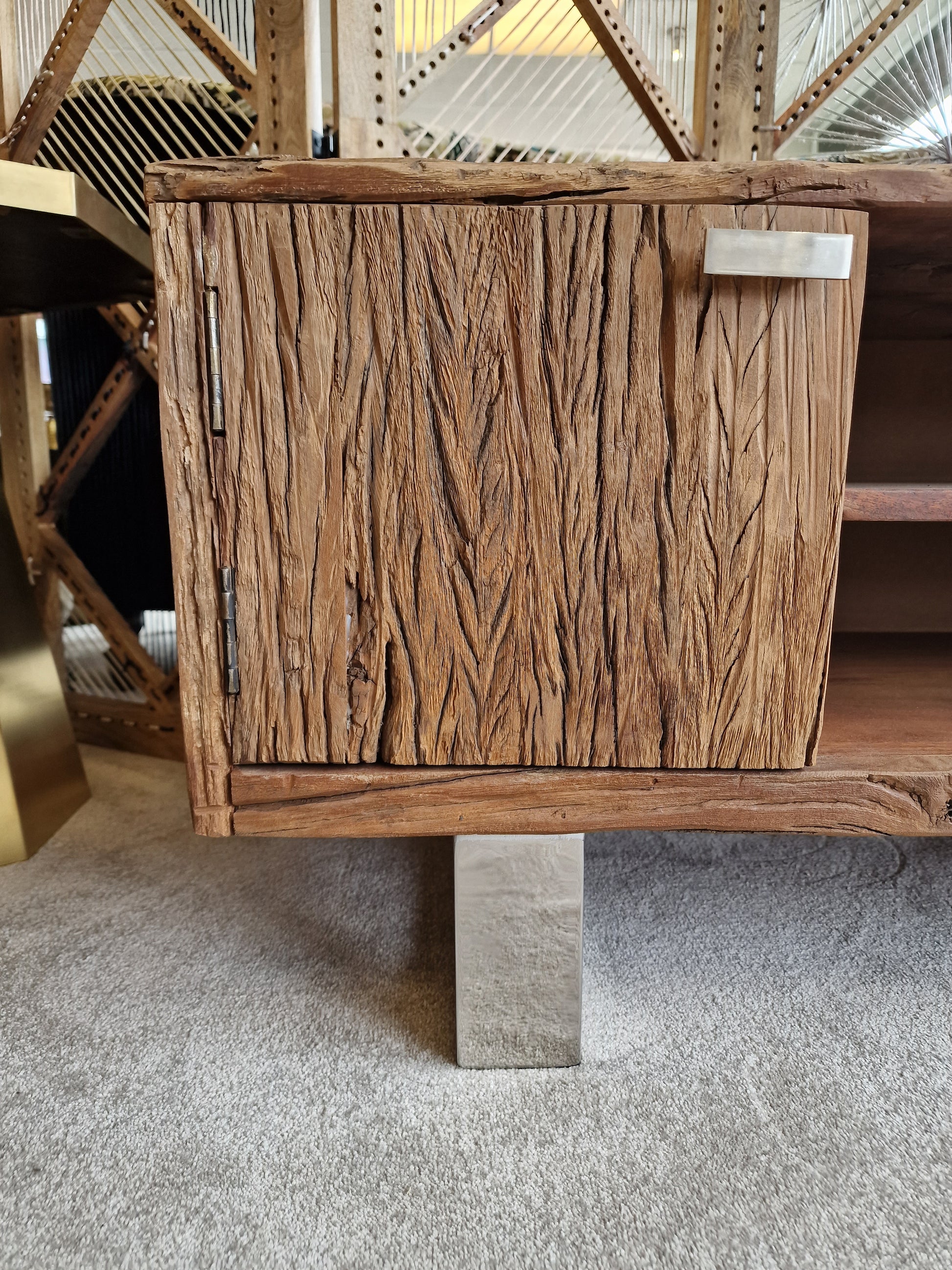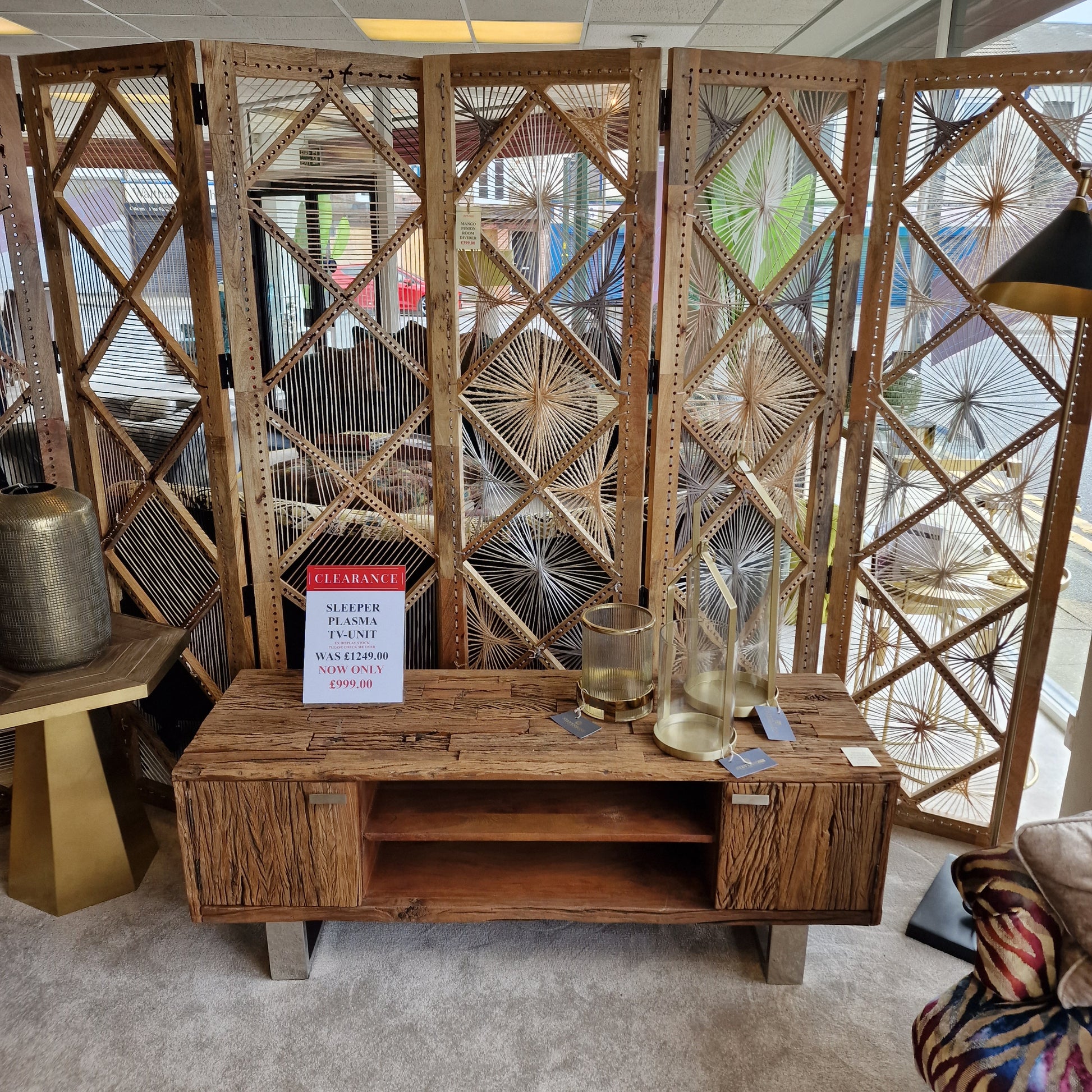 The Sleeper Plasma TV Unit is the perfect combination of style and storage. The textured and detailed wood combined with the chrome legs create a perfect blend of rustic and modern style. The two-door, two-drawer cupboard provides ample storage space without sacrificing the sleek design, making it the ideal choice for any living space. Matching display unit and nest of tables also available in our clearance section.