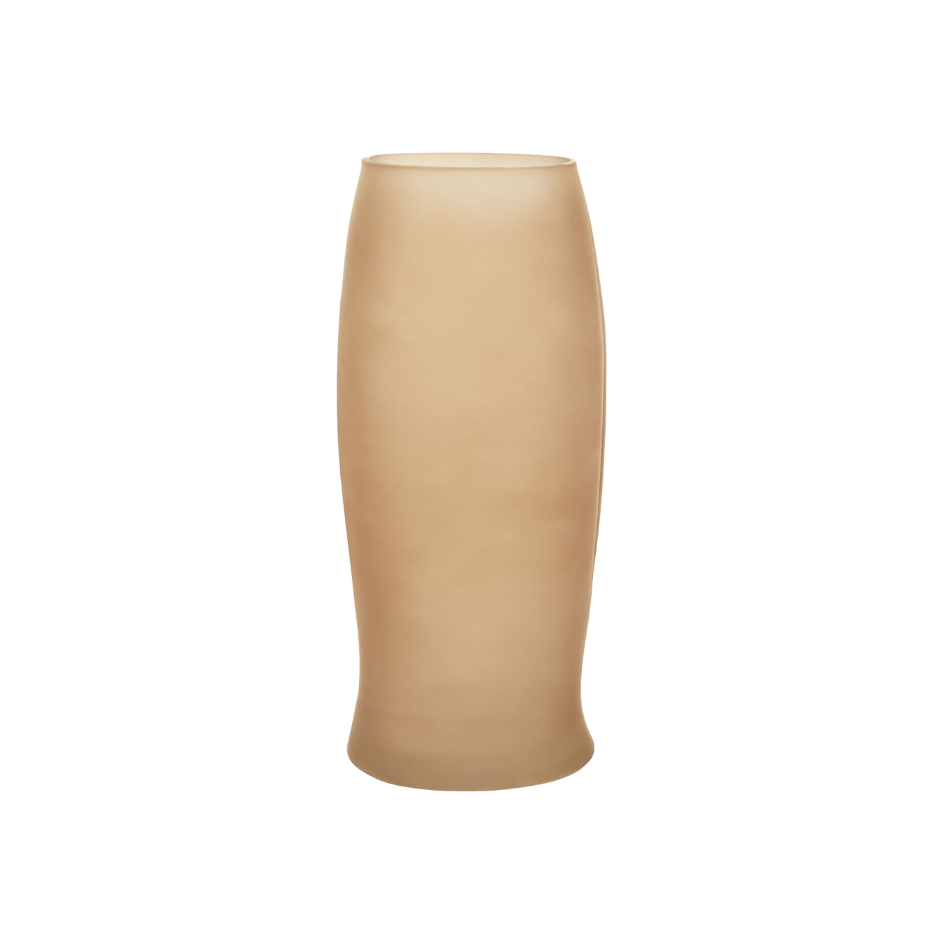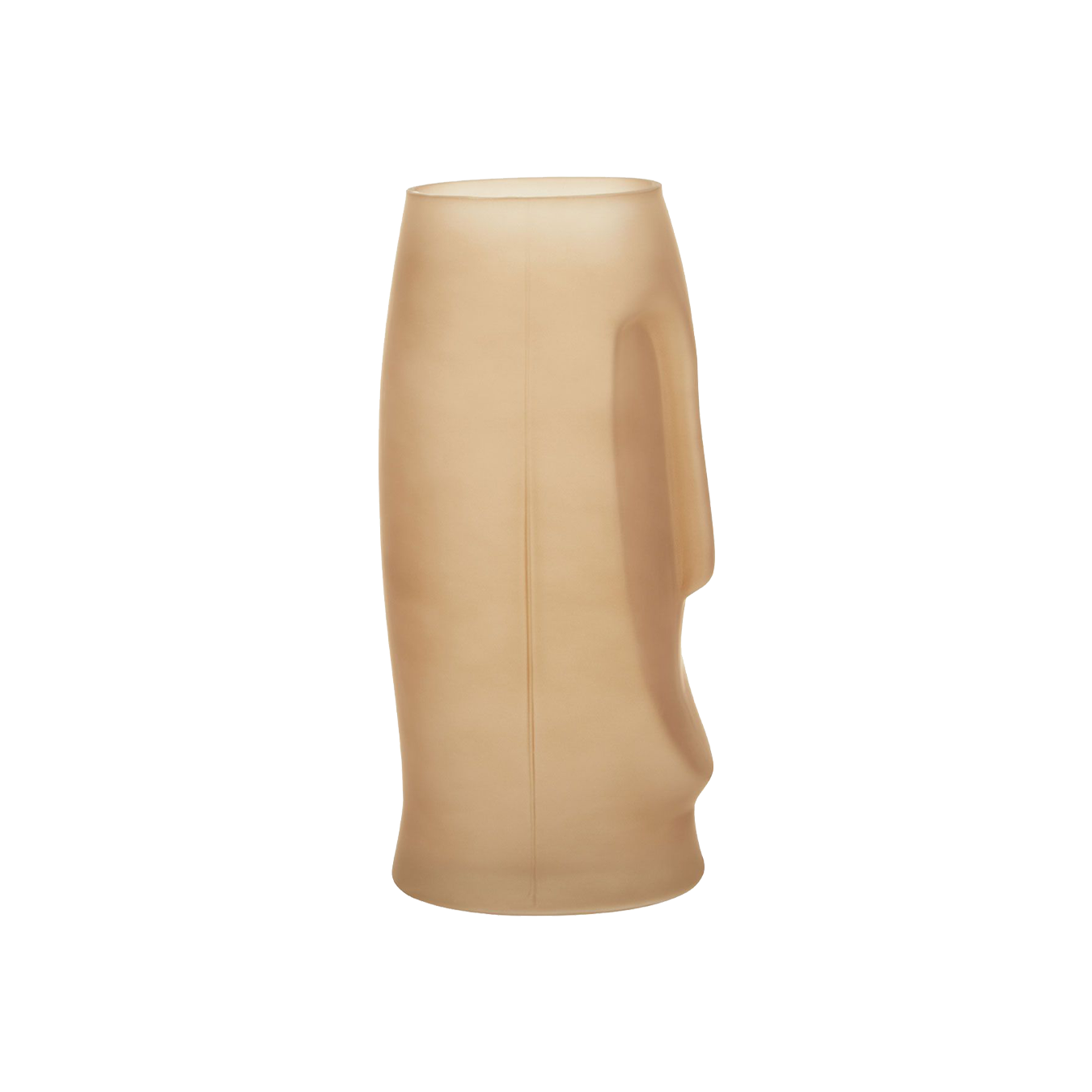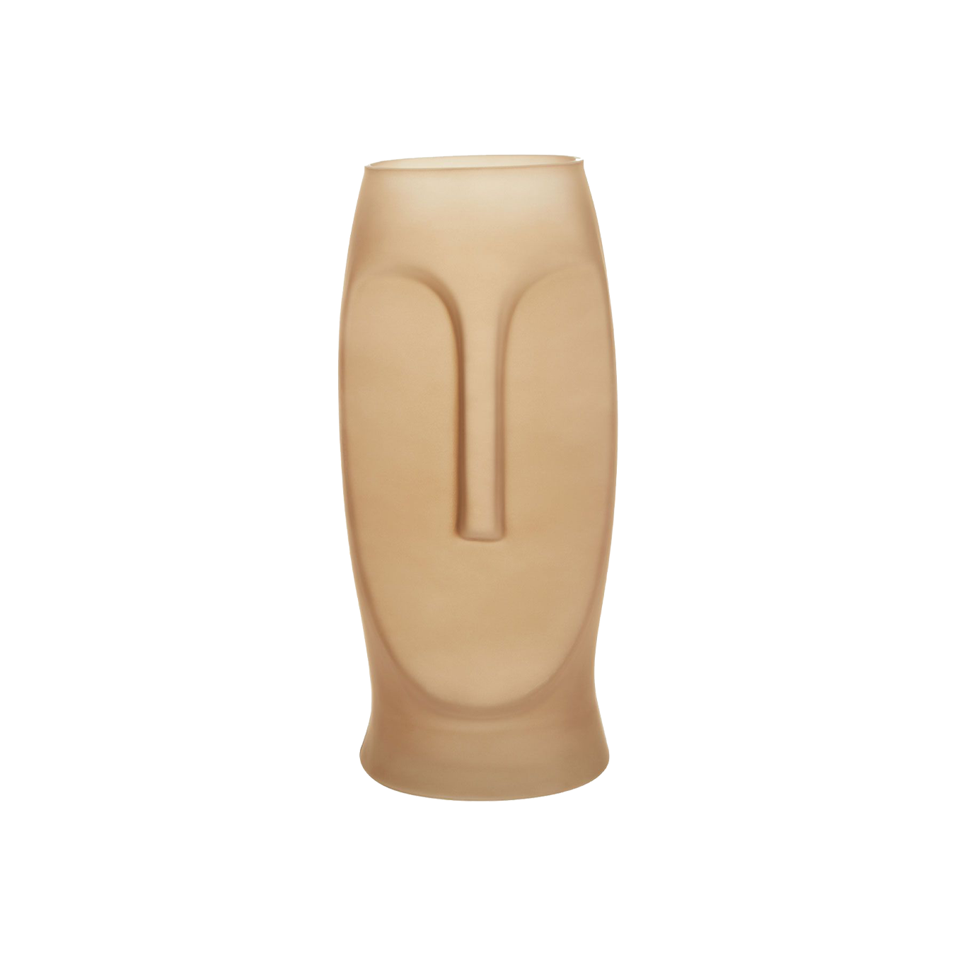 This vase boasts a sculptural accent to the interior and blends well with boho and tribal-inspired decors. This decorative vase is crafted from glass in a matte grey finish. Standing atop a round plinth base, this large vase exhibits elongated facial features helping the textured surface to glint under the light. This slender vase is ideal for long-stem flowers.