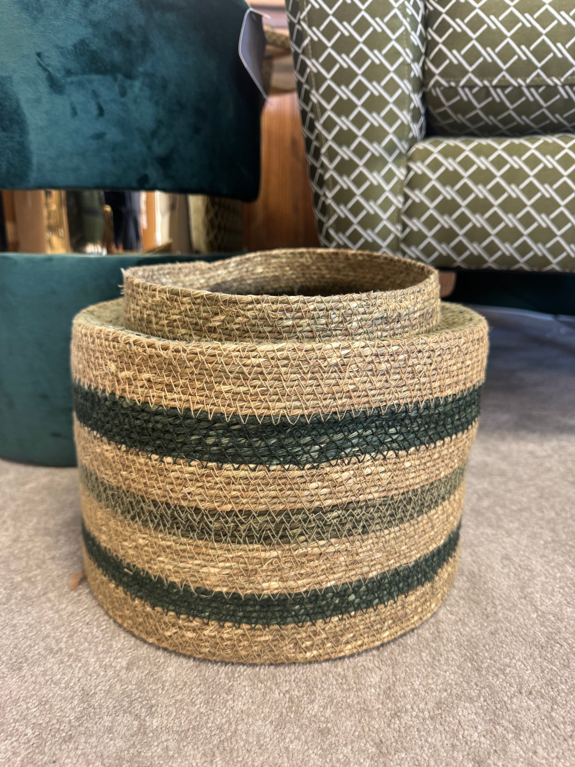 A nod to sun-warmed shores and tranquil tides, Solmere brings effortless coastal charm to your home. This finely woven cylindrical basket is crafted from natural seagrass and features a vibrant emerald stripe, blending earthy texture with a fresh pop of colour.