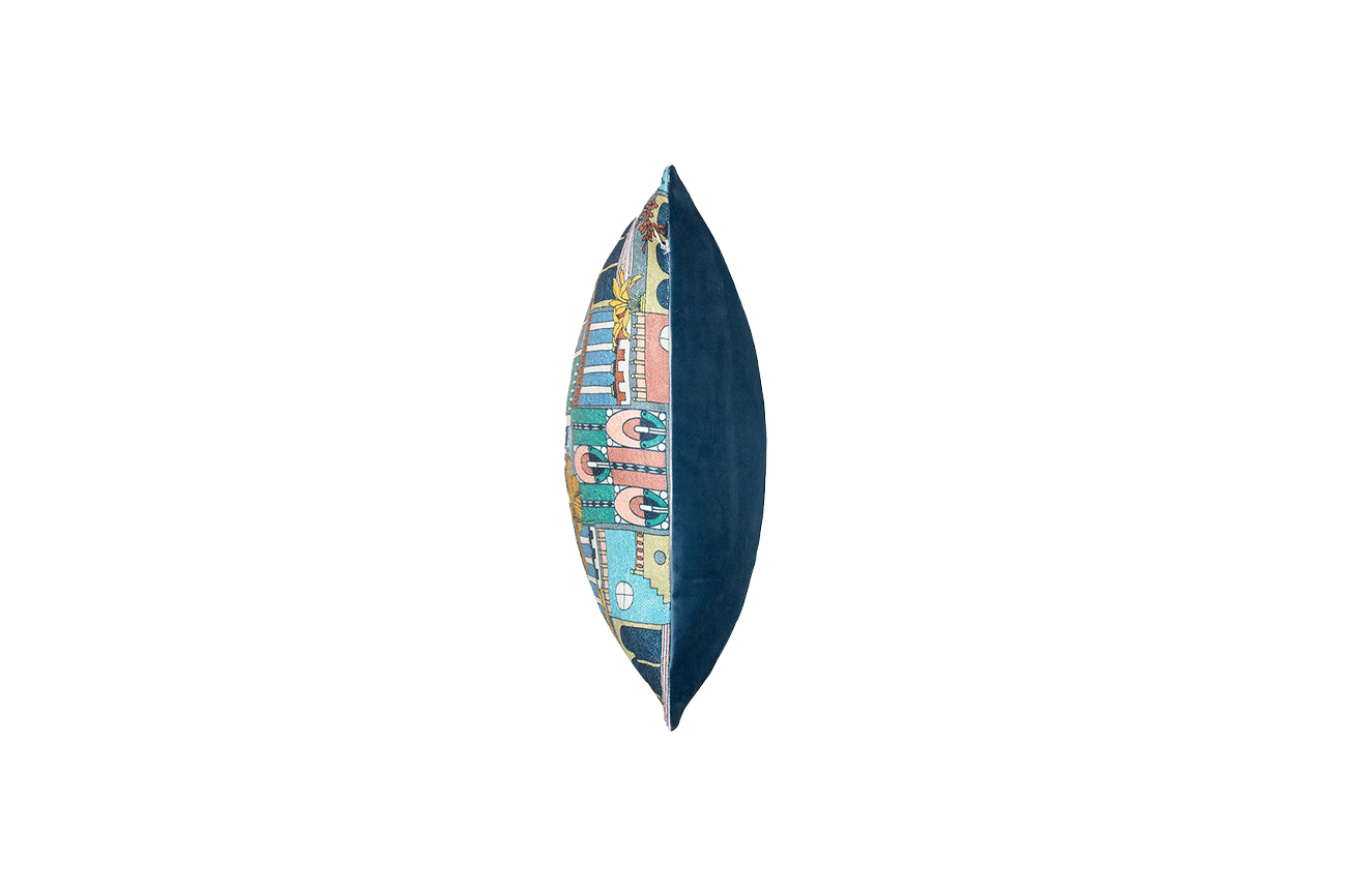 Adorned with a beautiful fun street scene. The Terraza cushion was hand painted in Ireland and translated to digital printing onto the finest lustrous tactile textured fabric with a coordinating velvet reverse. This cushion will bring personality & style to your home interiors.
