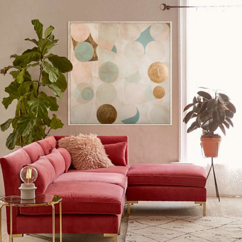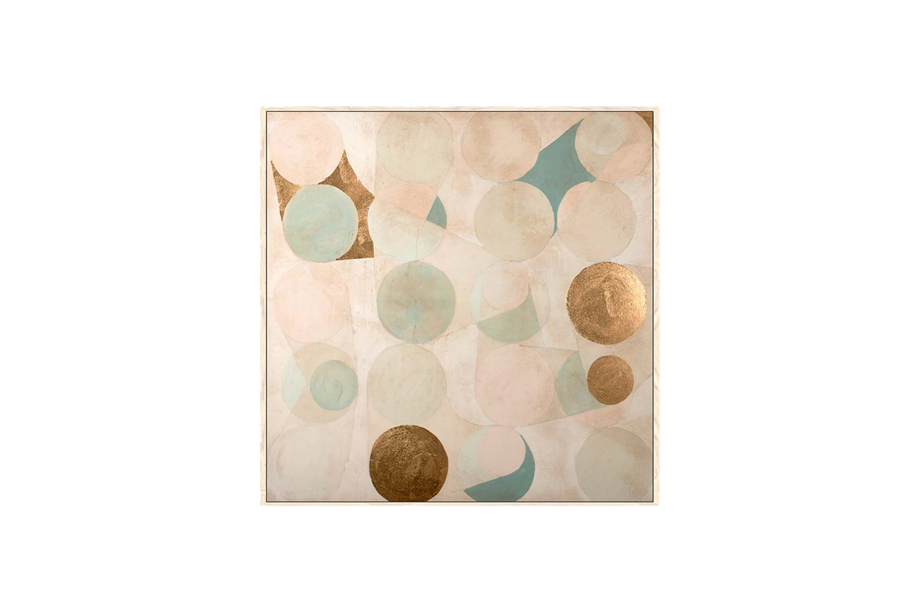 Tristen blends pale pinks, soft teals and copper leaf accents detail to draw in the eye upon entry. Whether set vertically or horizontally, this piece can transform your space in an instant. Tristen is a printed and hand-painted design, by artist Edward View.