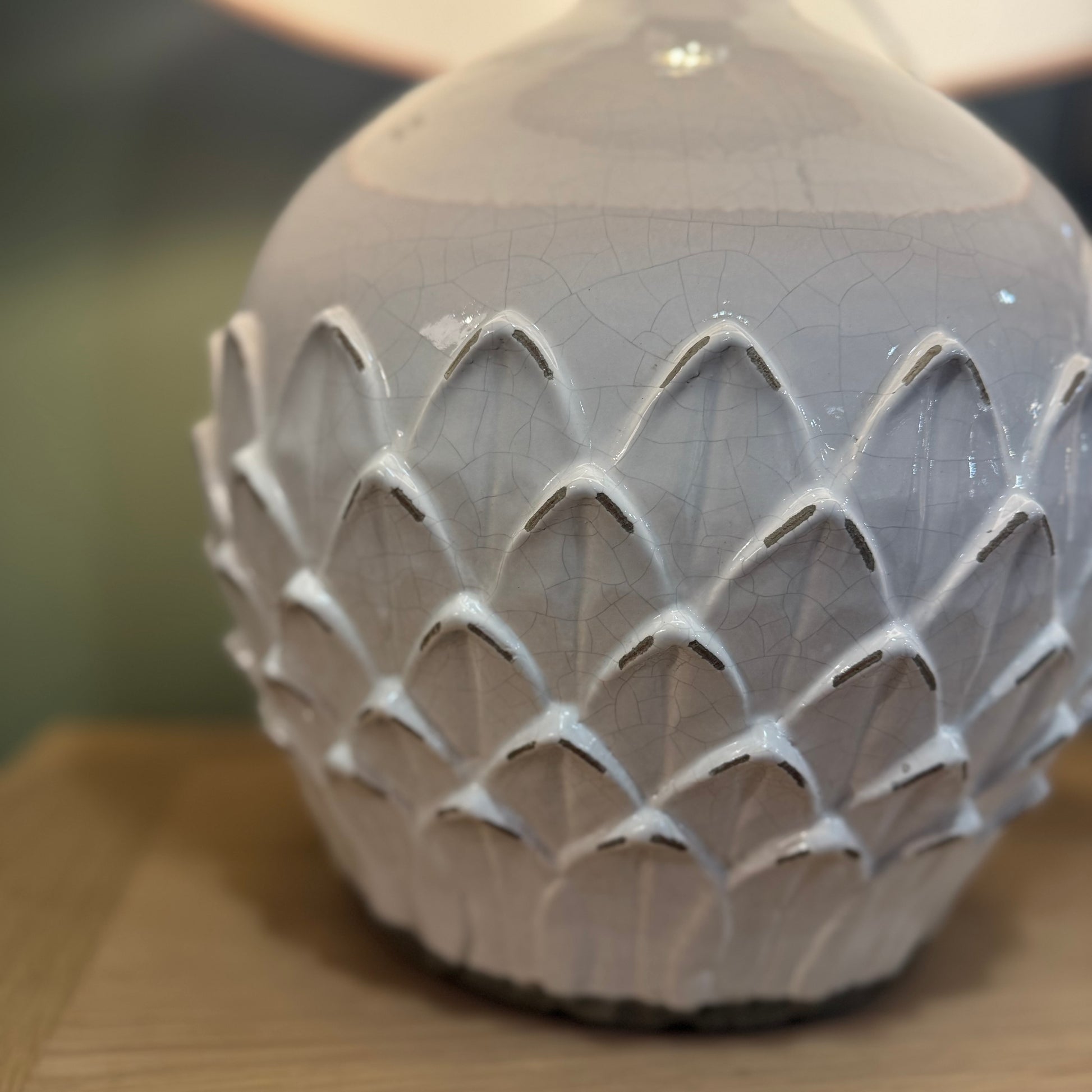 A beautifully crafted piece that blends texture, tone, and timeless style. The Thistlewhite lamp features a gently curved stoneware base in a soft, matte white finish, accented by subtle leaf-inspired textures and delicate distressing that adds a touch of artisanal charm.